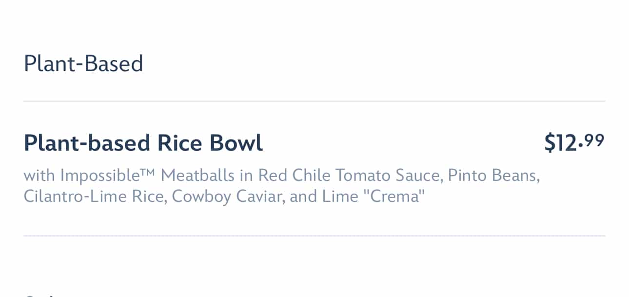 It is described as — Plant-based Rice Bowl with Impossible Meatballs, Red Chile Tomato Sauce, Pinto Beans, Cilantro-lime Rice, Cowboy Caviar, and Lime Crema. So basically the same toppings as the flatbread, without the corn masa bread. And the rice from the previously available rice bowl, which you CAN still order by itself without the meatballs and removing the queso fresco, but you will have to order it in person as the mobile order option on the app once again requires you to select a protein.