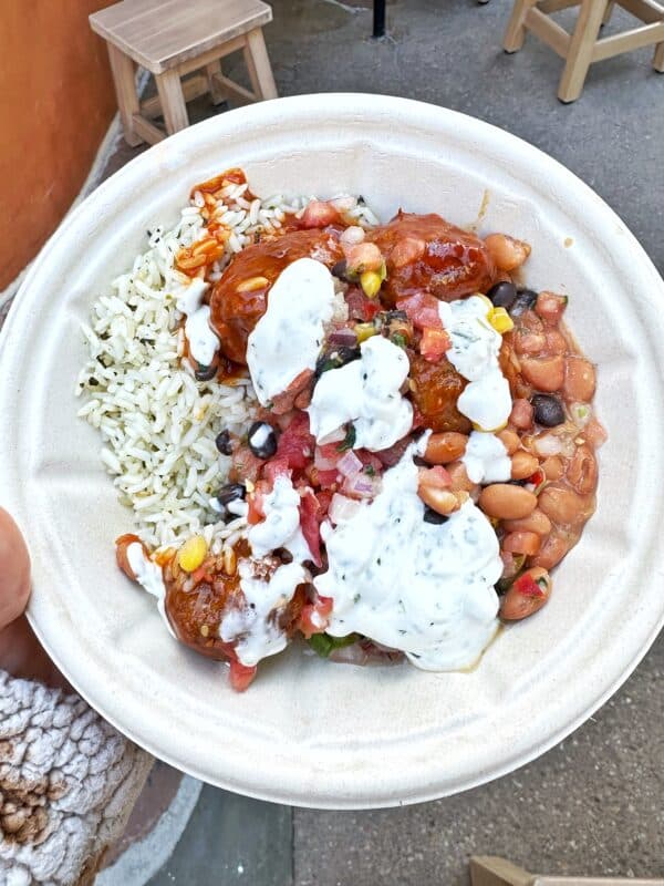 Speaking of textures, the combination of the corn and pico in the cowboy caviar, the pinto beans, and the rice, along with the crema, really packs a satisfying punch. If they threw some fritos on top, it would be an even more magical option. Overall, the mix of ingredients in this bowl are packed with tex mex goodness and if you enjoy those piquant flavors, you will like this filling lunch or dinner option. I would get it again, and I’m glad we are able to order it without the meatballs for those that don’t partake in plant-based meats.