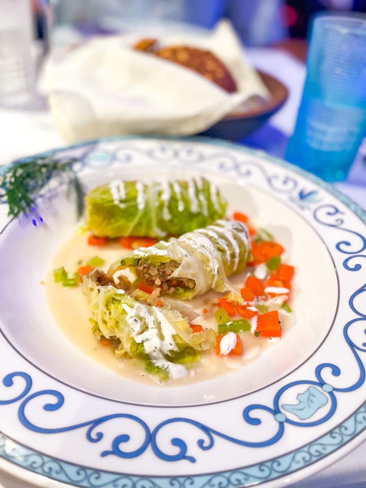 Kaldolmar – plant-based “beef,’ savoy cabbage, brown rice, carrots, celery, dill yogurt drizzle (gluten and dairy free) – this is vegan as is