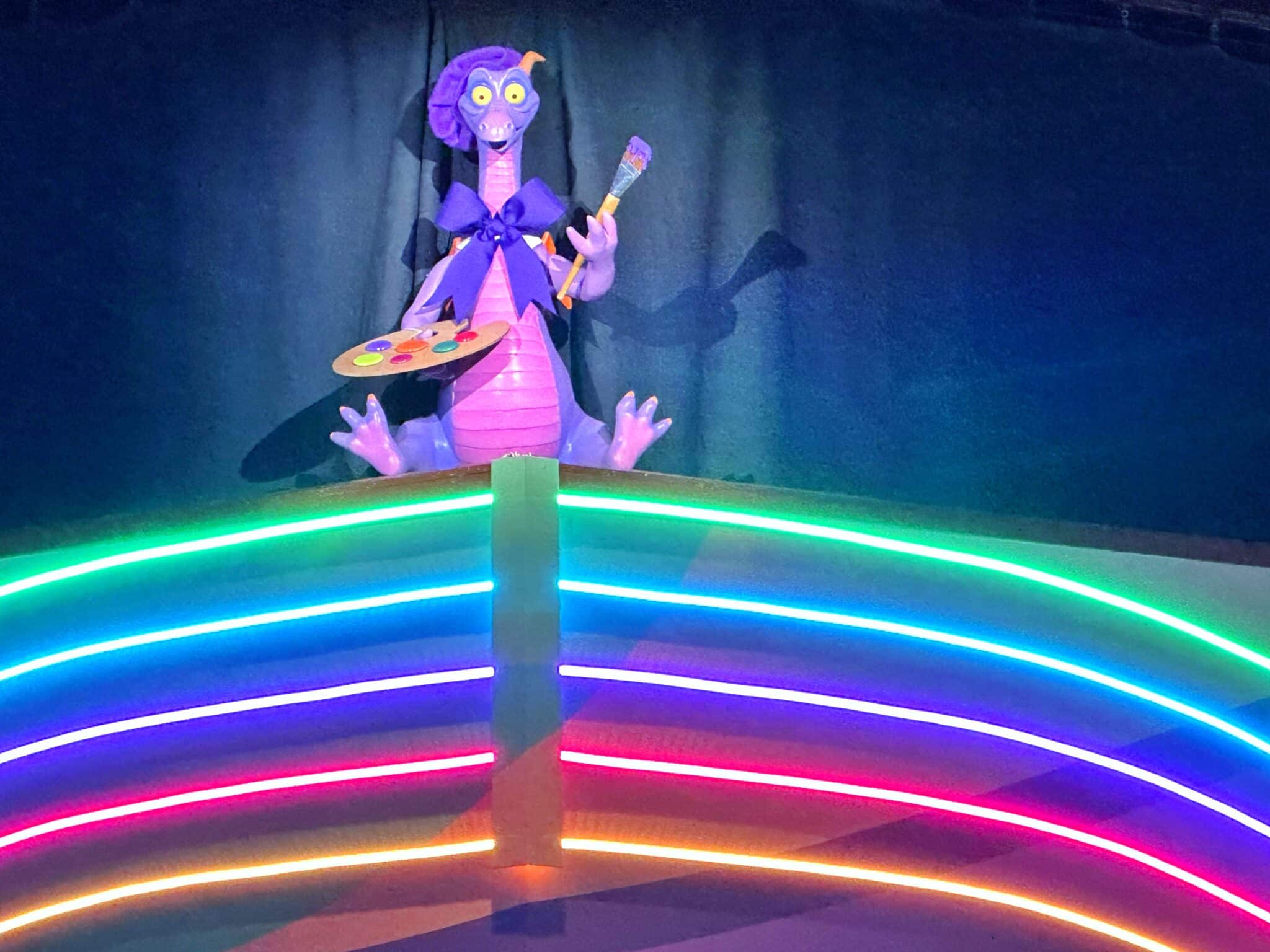 Make sure you take time to enjoy all the art displays, including the interactive paint-by-numbers mosaic and photo ops throughout EPCOT. And be sure to watch the TWO Beacons of Magic shows on Spaceship Earth after sunset. There’s a Rainbow Connection one and a Figment one which features almost the whole original ride soundtrack to Journey into Imagination. We’ll have that on our upcoming video soon!