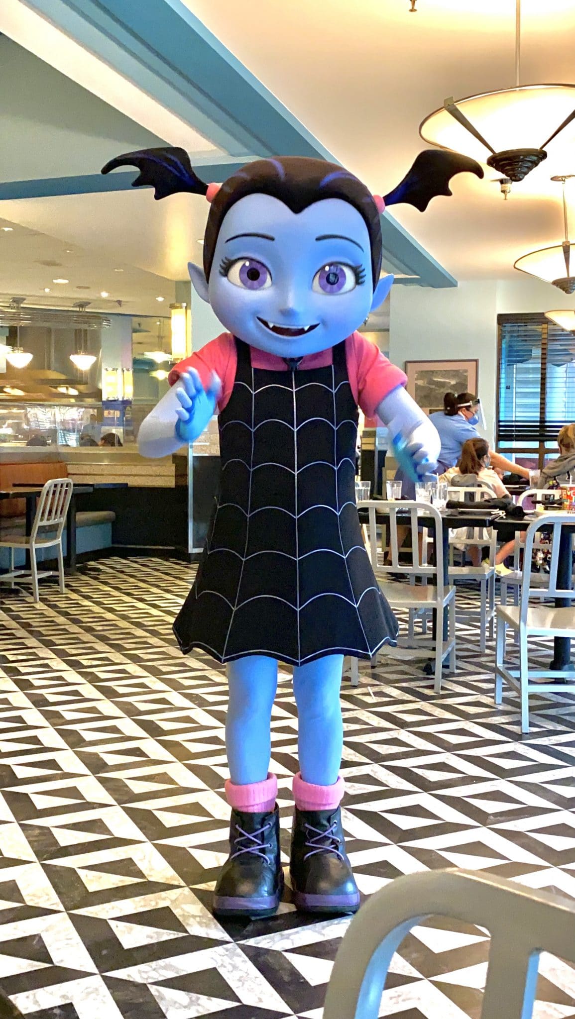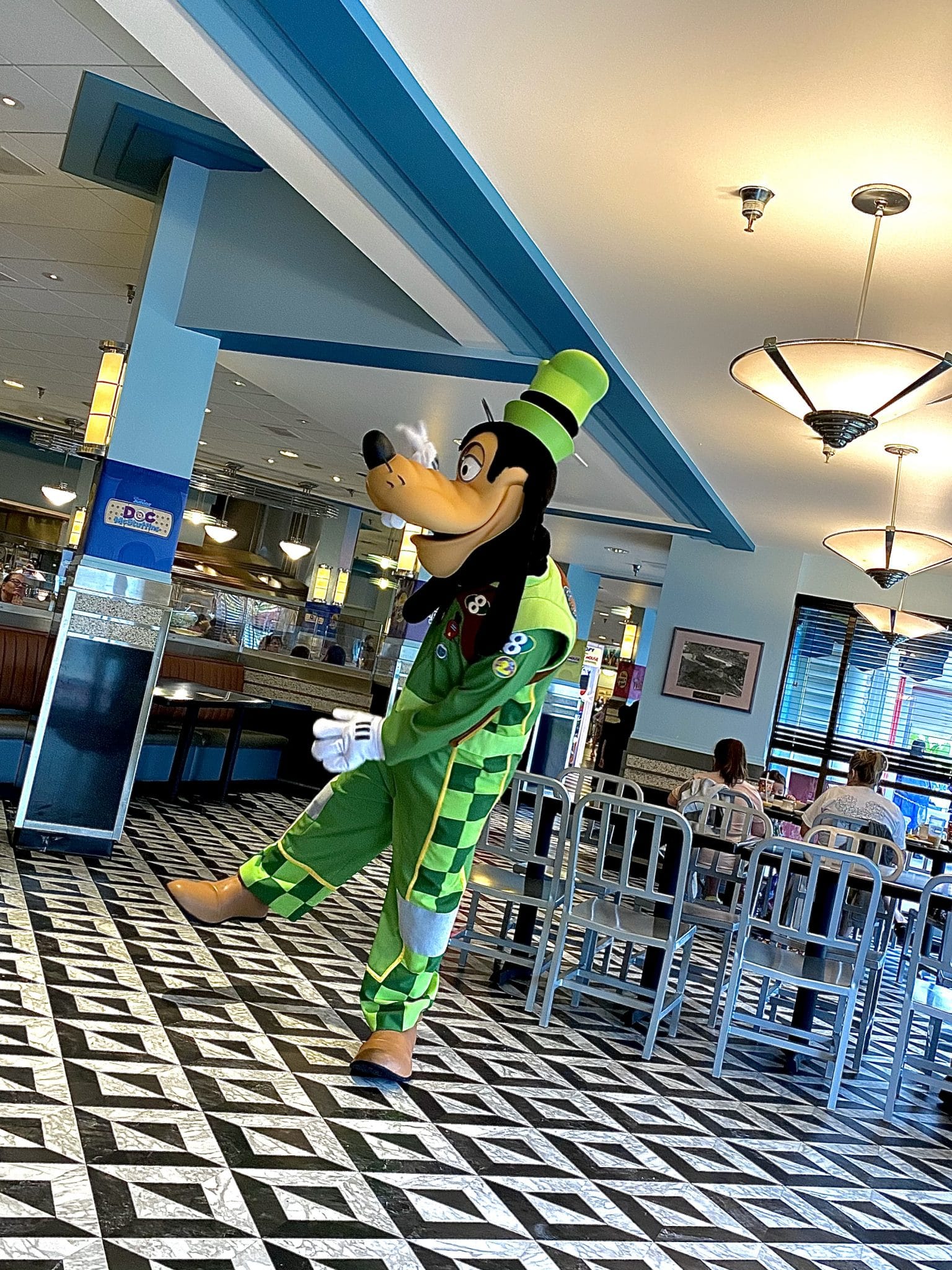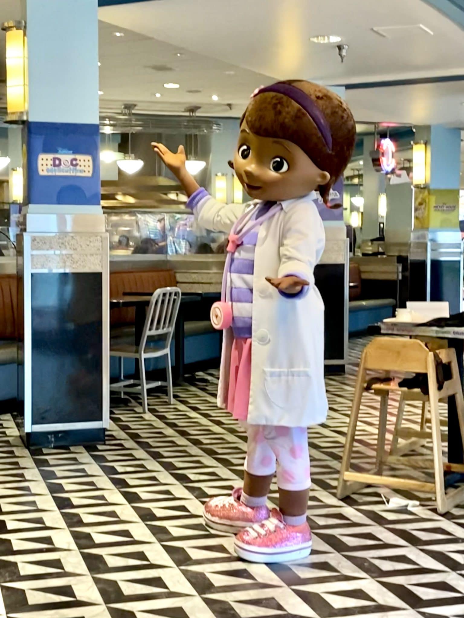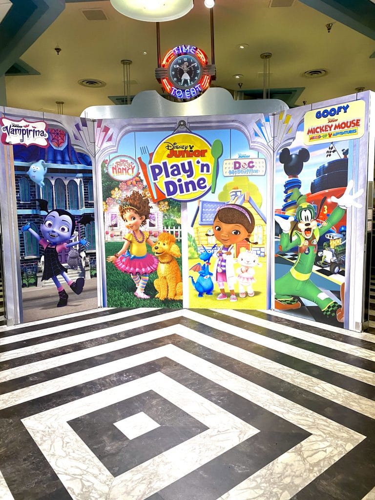 During lunch and dinner service, Mickey, Minnie, Daisy, Donald, and Goofy stop by for a visit. Breakfast is unique in that its theme is Disney Junior characters. You’ll get visits with Doc McStuffins, Vampirina, Fancy Nancy and even Roadster Goofy.