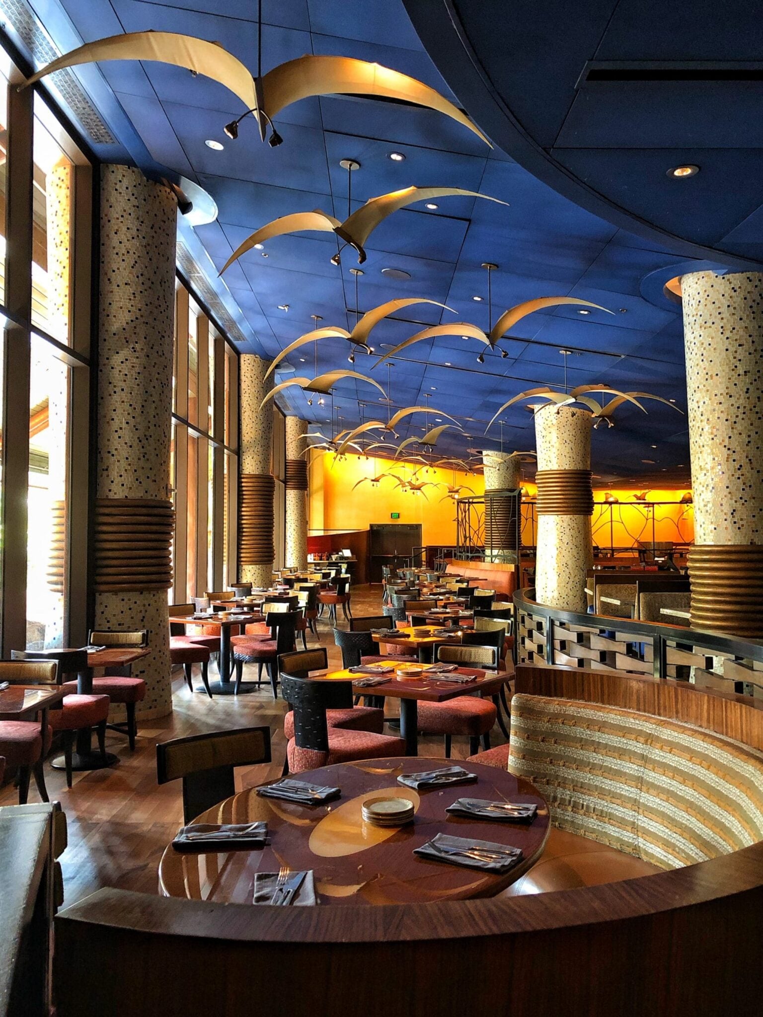 The atmosphere at Jiko is warm and inviting and is supposed to mimic an African sunset in its design. The ceiling with its birds in flight is a dark blue hue which sets off the bright yellow rear accent wall. The floor has hour-glass-shaped cut-outs which represent hay stacks in the field. The birds above represent the Canoe birds, which were said to bring prosperity and good harvest if they flew over farms, and luck to people they flew over.
