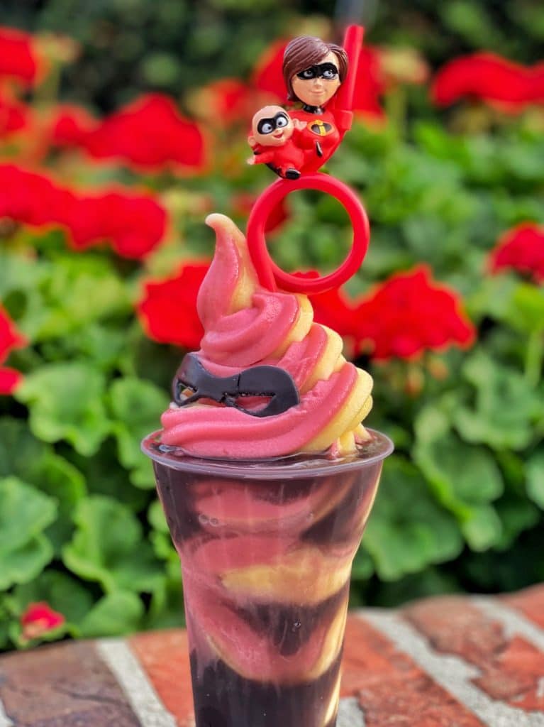 There are as many Dole Whip flavors as days of the week right now at Walt Disney World! We’ve got classic pineapple, we’ve got raspberry, we’ve got orange, we’ve got lime, we’ve got cherry, and now we’ve got lemon swirled with strawberry in a float. Celebrating #HERStory or Women’s History Month at Disney Springs, you can now enjoy Mrs. Incredible in Dole Whip form with a souvenir straw. Best of all, it’s completely vegan as is, including the gum paste mask!