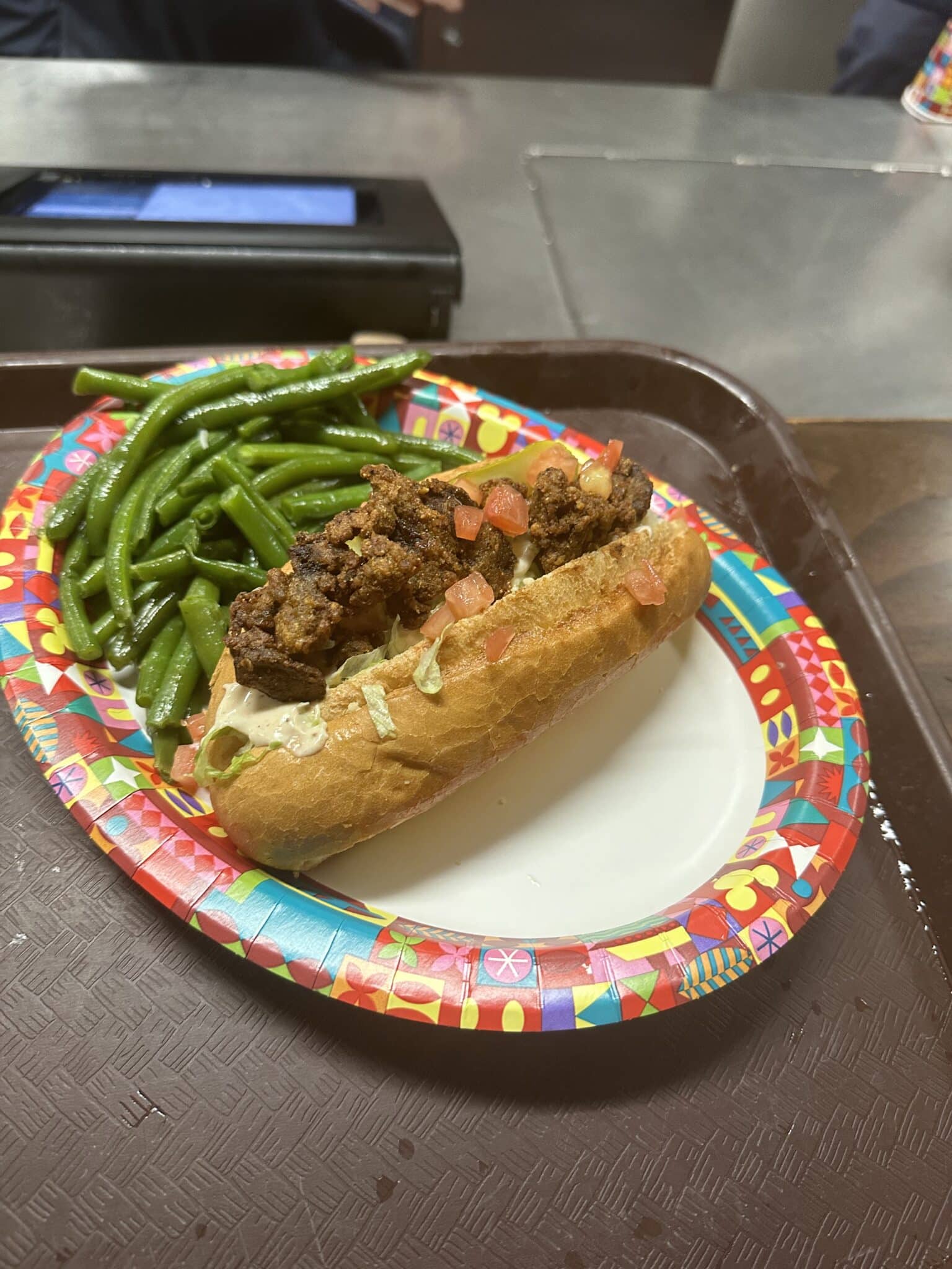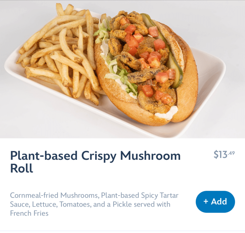 When I first saw this menu change in the My Disney Experience app, I was SO excited. Growing up in Massachusetts, seafood rolls are plentiful, and while I never really was a big clam roll or lobster roll person, my entire family was, so it’s kind of a comfort type food in a way. Even though the vegan “lobster roll” in Disney’s Hollywood Studios at Rosie’s All-American Cafe is nothing like lobster, it’s a vinegary marinated hearts of palm salad and I love vinegary type things, so I enjoy it. I was hoping this new vegan Mushroom Roll would be a take on a New England clam roll, but with the cornmeal breading described, along with the tomato and pickle, I realized it may have been more like a Po Boy. Either way, I was still excited since I am also a mushroom fan (I know many of you are not). So we headed over to give this a try on opening night of its menu debut.