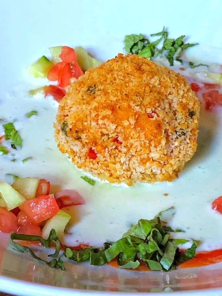 Last month on a visit to DHS I had the opportunity to speak with the head chef at Mama Melrose’s Ristorante Italiano who hinted that a new vegan appetizer (and dessert) would be coming to the menu soon. He couldn’t tell me the exact date so I’ve been checking the online menu for changes and last night, low and behold there it was…Plant-based Arancini!