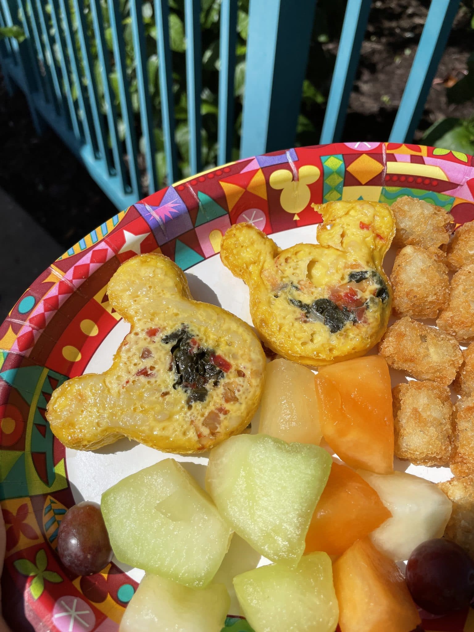 The Plant-based Mickey Frittata is made with Just Egg, spinach, tomatoes and onions, with plant-based mozzarella, served with potato barrels and mixed fruit – $10.99