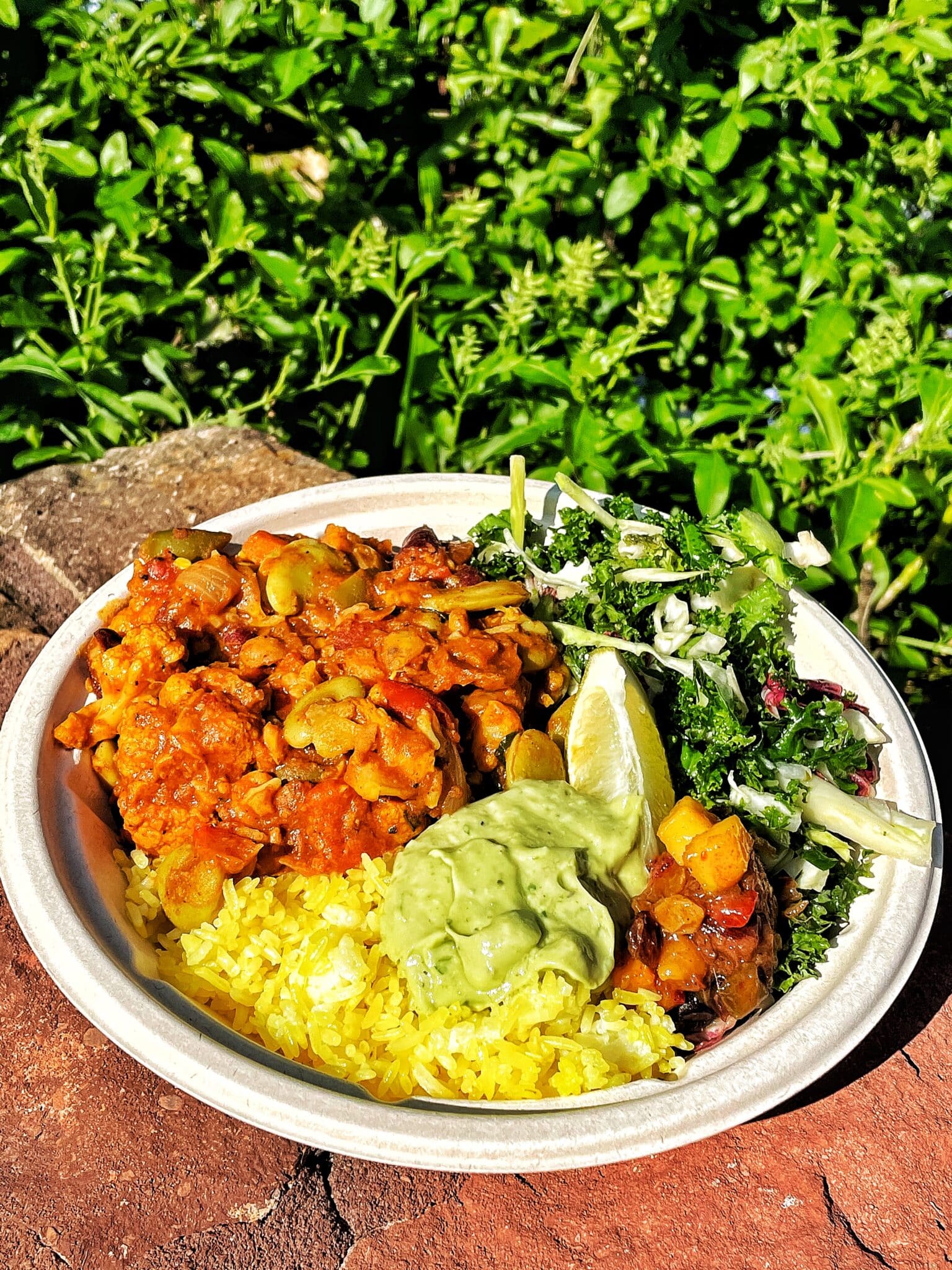 - South African Vegetable Bowl: Curried vegetable stew, pilau rice, kale slaw, dried fruit achar, and avocado-tahini sauce (Plant-based)