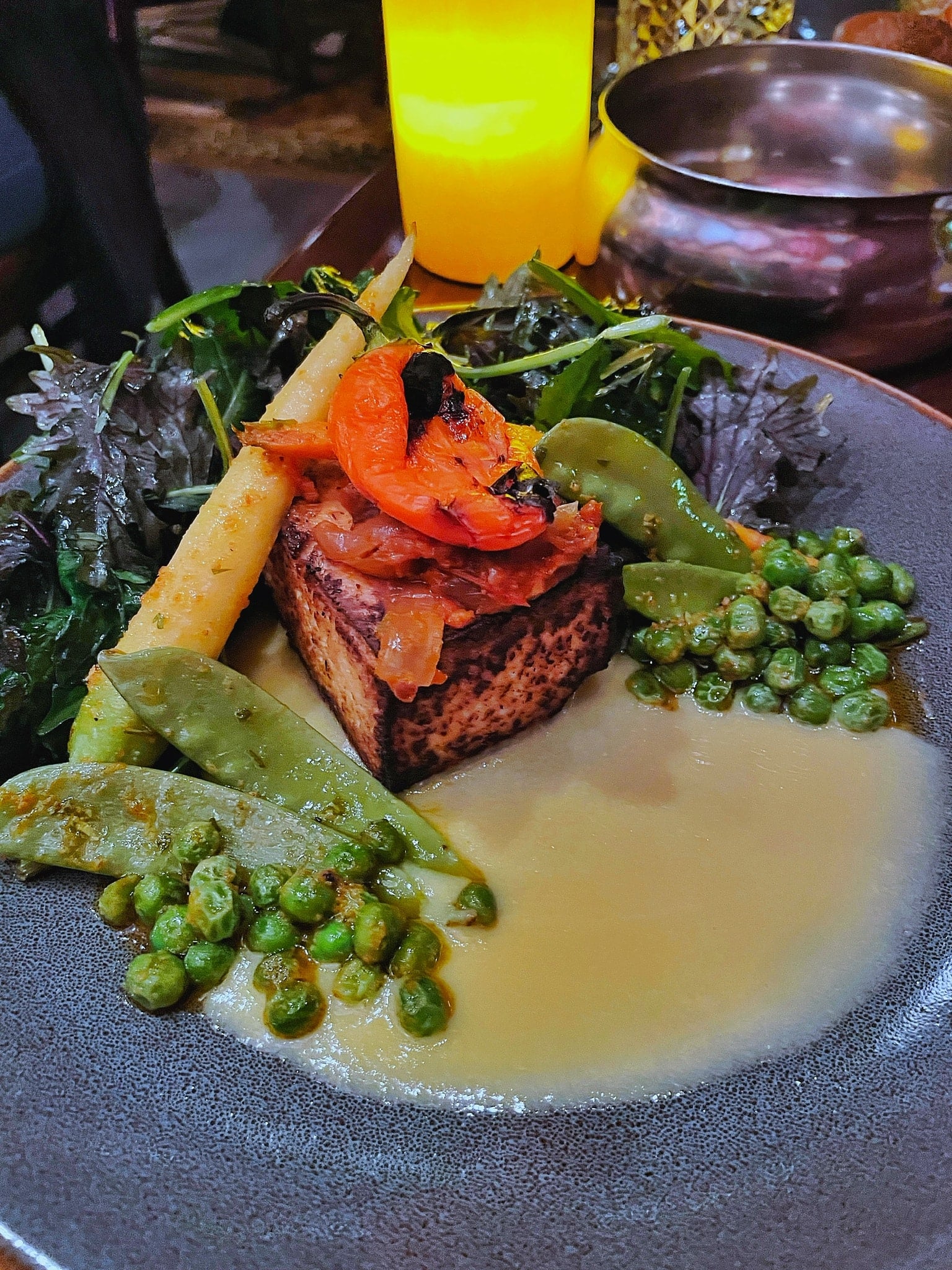 The plating of this entree is stunning and includes chermoula infused seasonal vegetables like peas, carrots and peppers served alongside greens. Seared tofu is topped with chakalaka, which is a spicy South African onion and tomato medley, and edible flowers.