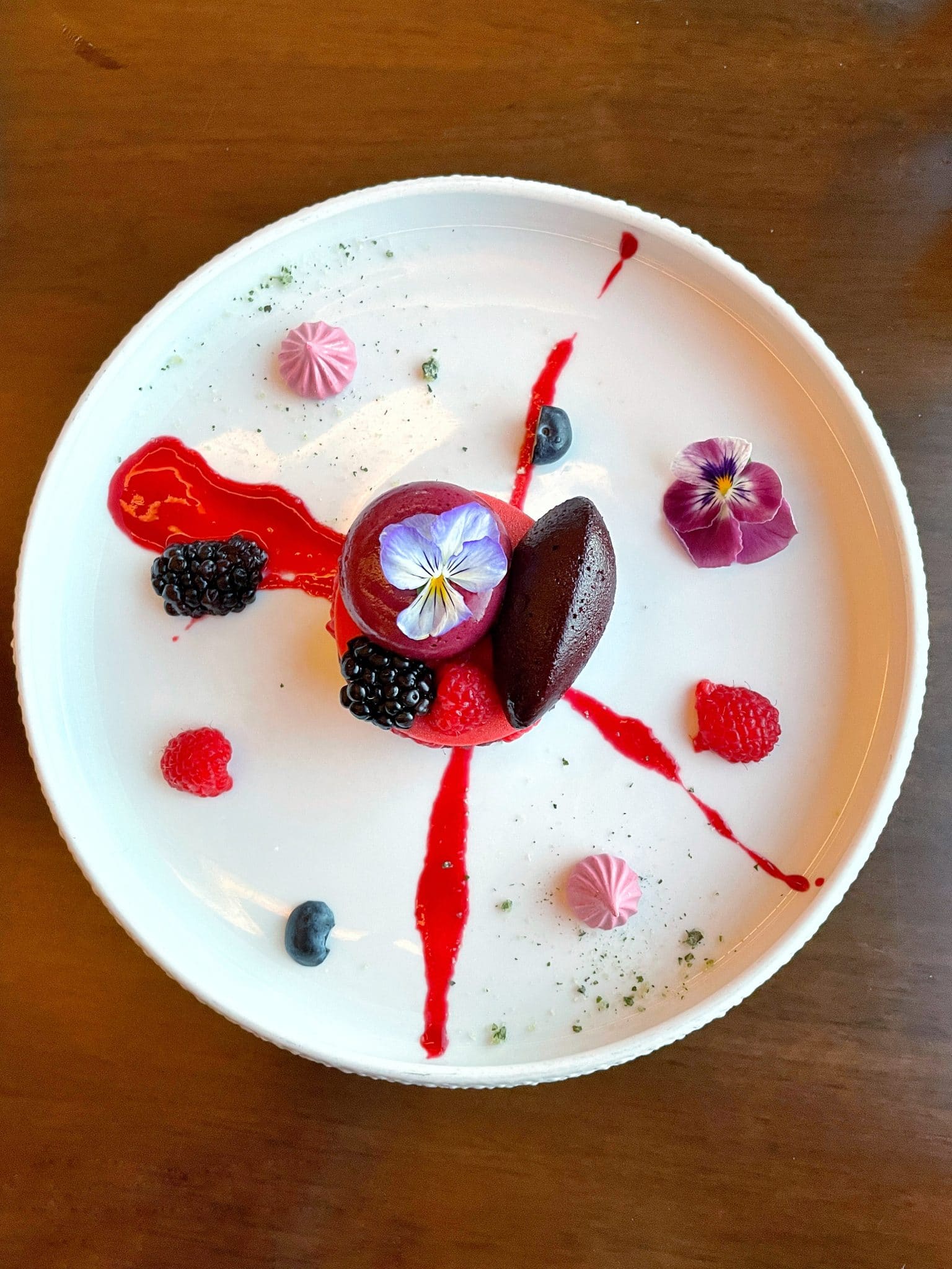 A hibiscus cake is topped with black currant mousse and basil-blueberry sorbet. The plate gets a garnish of macerated berries and an edible flower finishes the dish. Prior to the menu change this dessert featured raspberry sorbet so this is a surprising and delightful change.