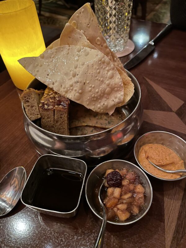 Here’s the new vegan options above, with the vegan as-is sauces: Coconut Thai Curry Sauce, Ginger Apricot Sauce, and Guava sauce. Pappadam can be added if you are okay with the shared fryer. Below is the regular bread service as it comes now at Tiffins: