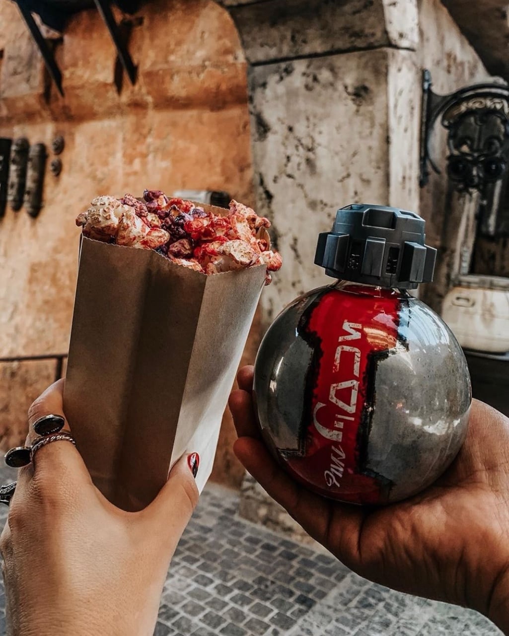 Batuu snackin’ equates to blueberry lemon pound cake, red chili lime popcorn and a Coke.