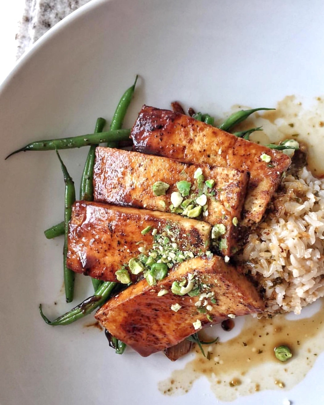What you’ll get is four perfectly glazed tofu steaks served over French green beans topped with a ginger soy vinaigrette. The dish gets a sprinkling of crushed wasabi peas for texture and a little bit of a kick. Lemon sticky rice accompanies the tofu.