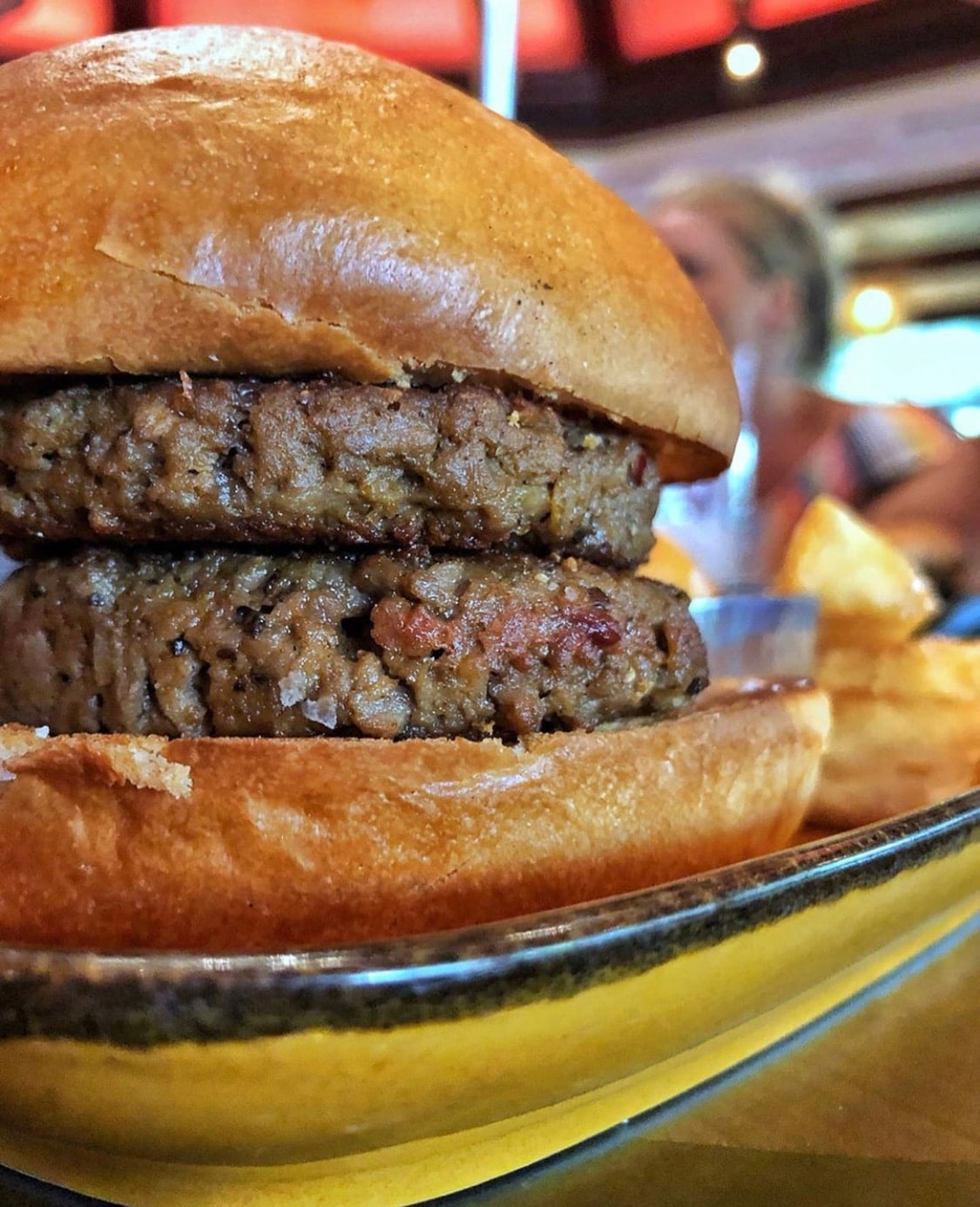 You can find this vegan double stacked Impossible burger in the Animal Kingdom theme park at Nomad Lounge.
