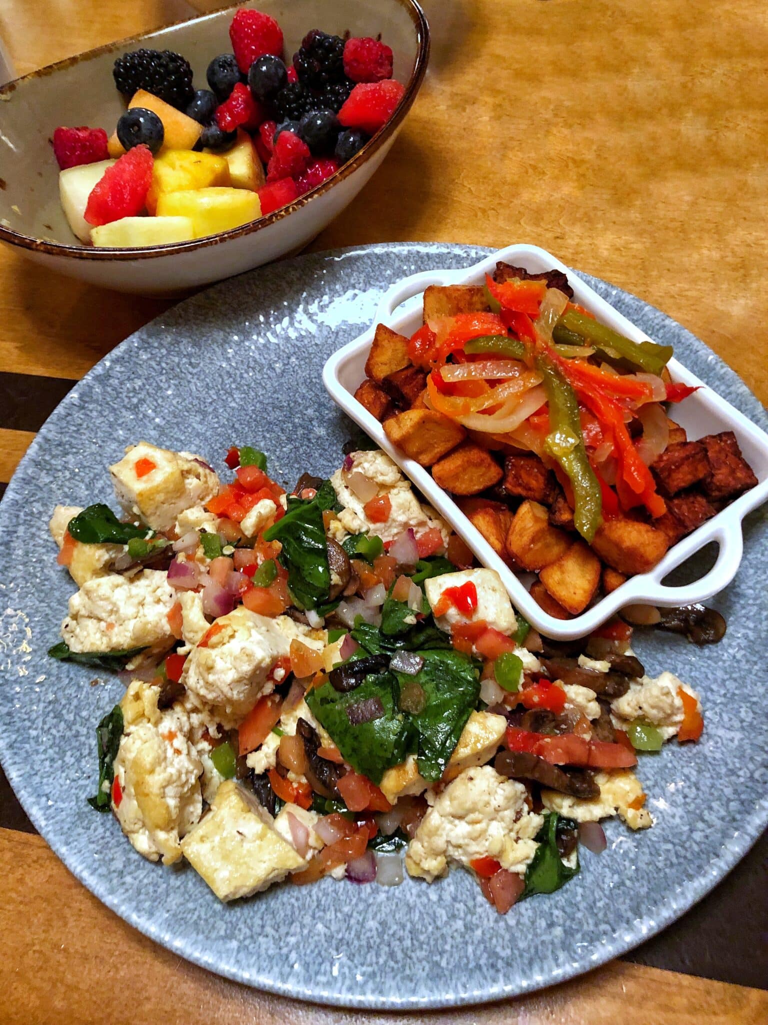 Instead of eggs you’ll get cubed tofu mixed with mushrooms, onions, tomatoes, red bell peppers, green bell peppers and spinach.