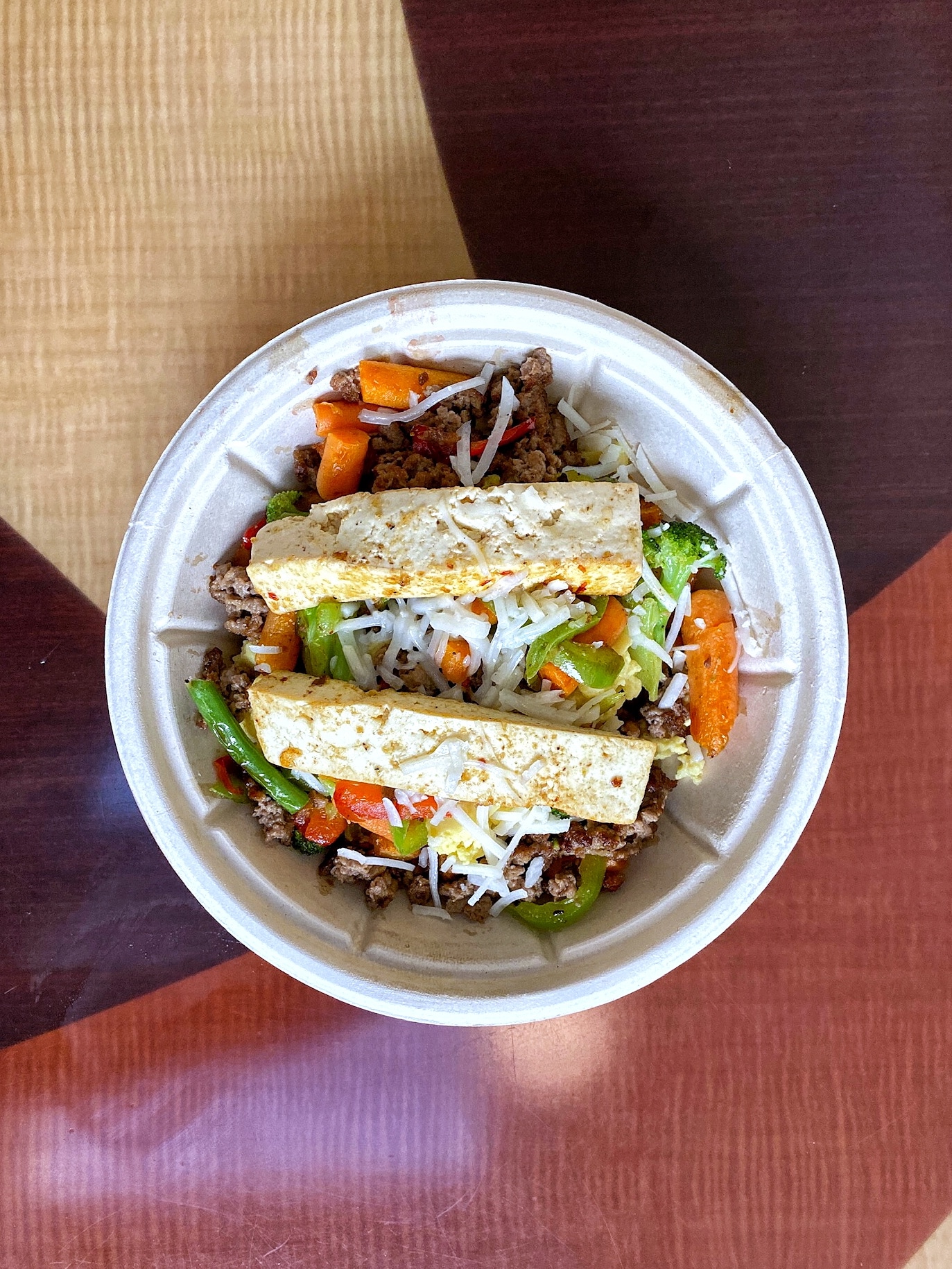 The mung bean scramble is JUST egg. The sausage crumbles are composed of Impossible Foods “meat” and the cheddar cheese is Daiya brand. The veggie selection in our bowl was a mix of carrots, green beans, broccoli, red bell peppers and green bell peppers.