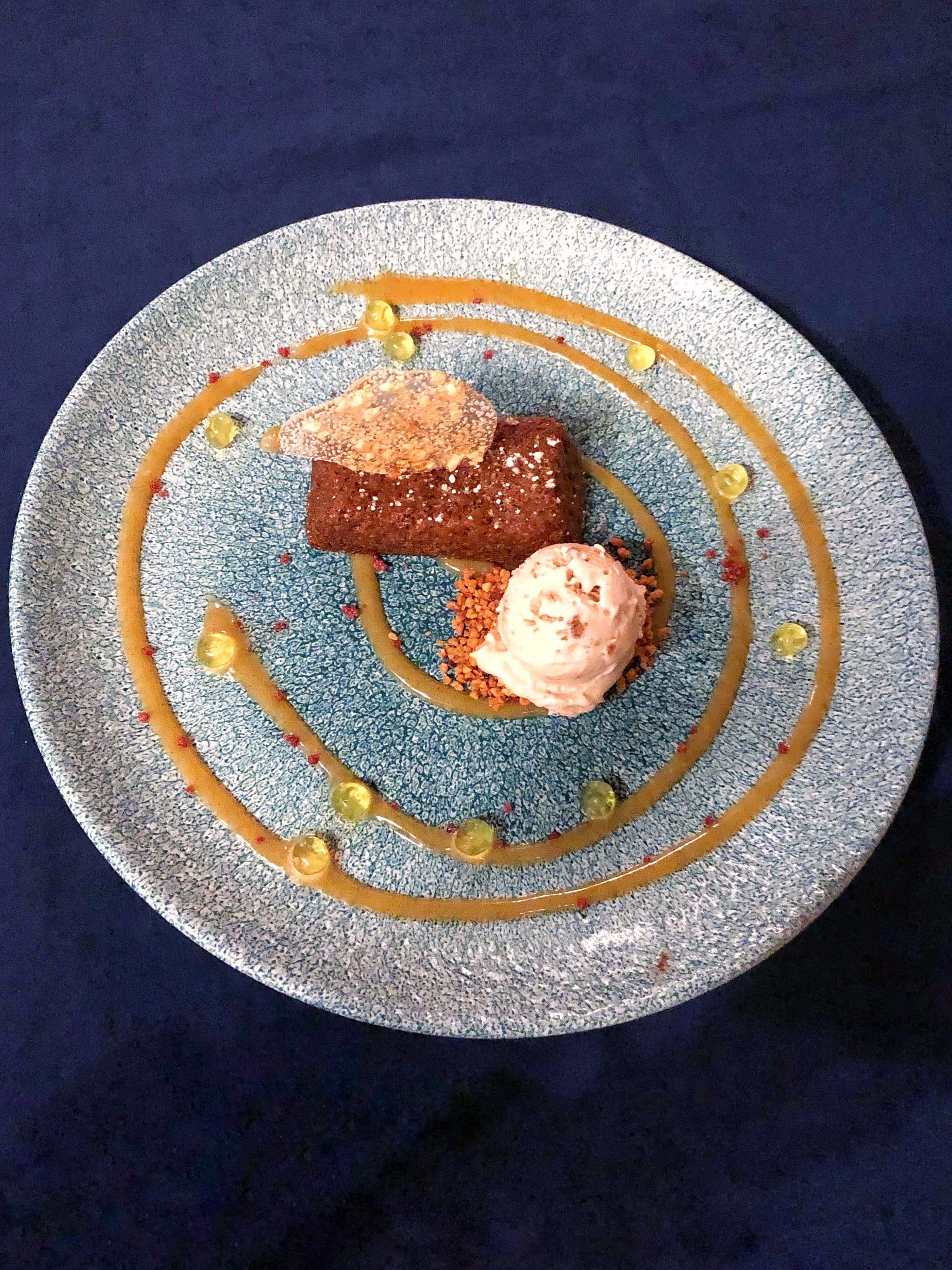 It’s a southern style vegan carrot cake with pineapple popping boba, praline croquant, salted caramel and a scoop of candied pecan coconut milk based ice cream.