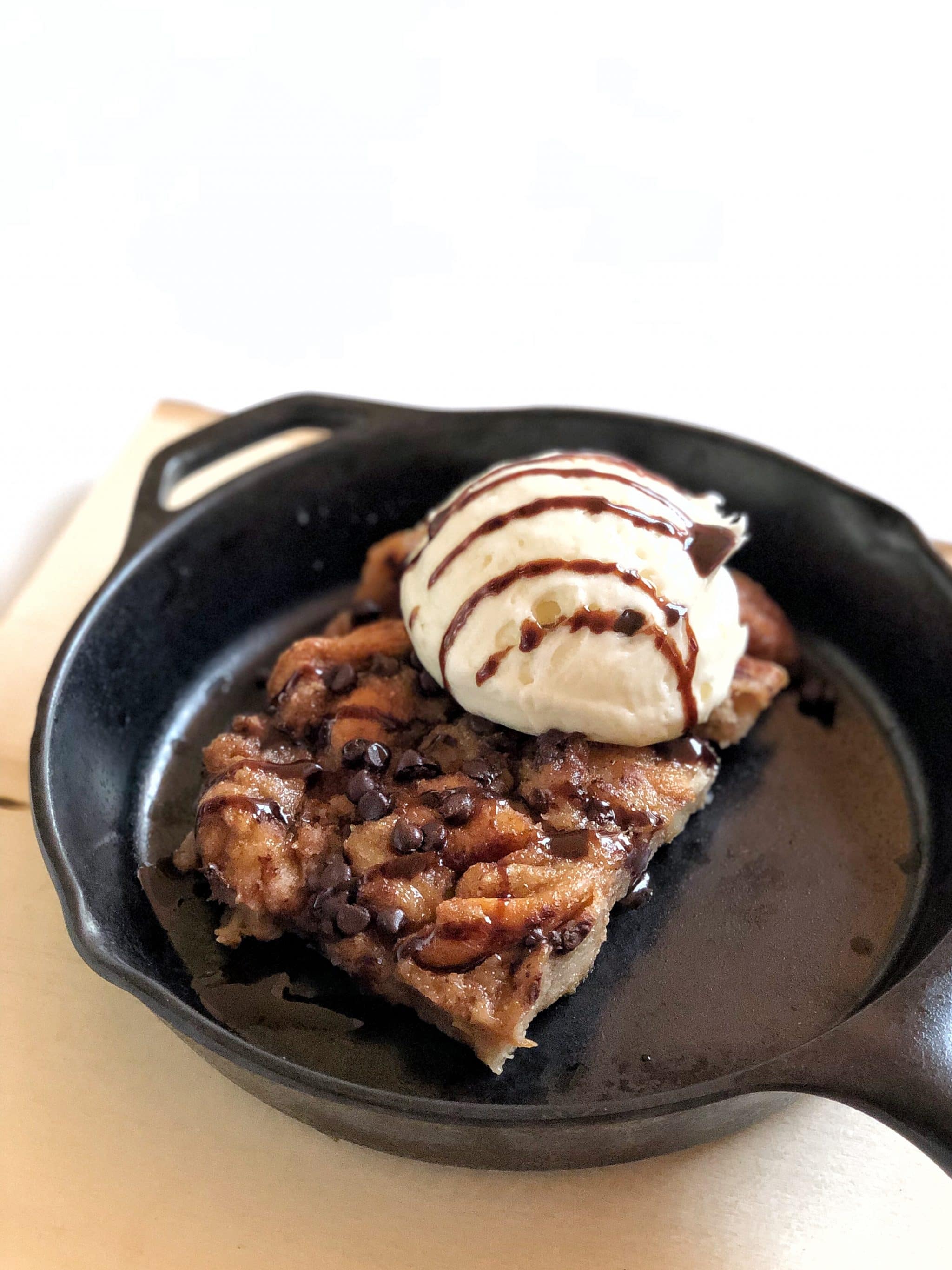 It’s a banana bread pudding topped with a vegan caramel sauce, dark chocolate chips and a soy based vegan ice cream.