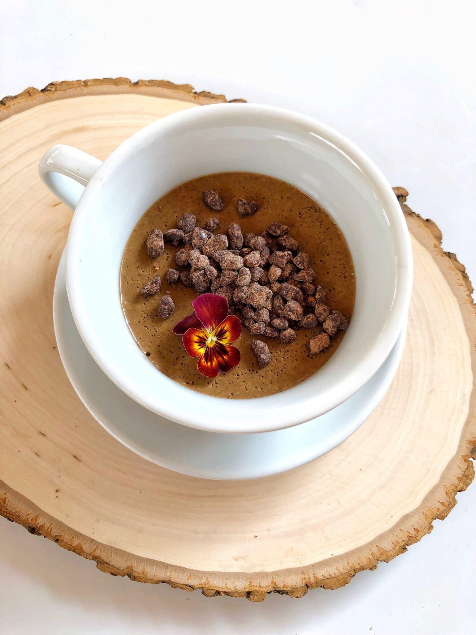It’s a coffee flavored concoction similar in texture to a panna cotta. It was topped with dark chocolate and an edible flower.