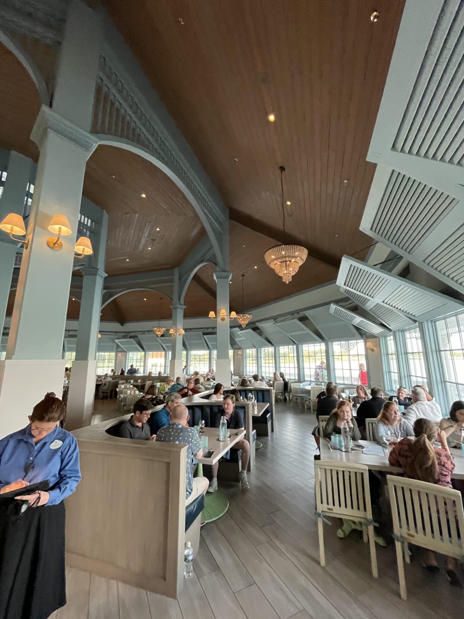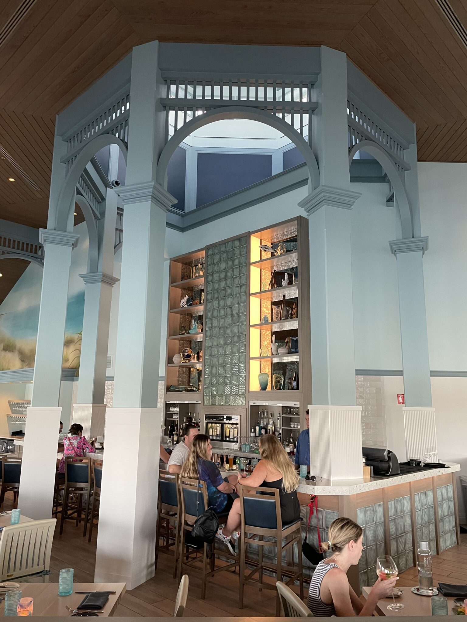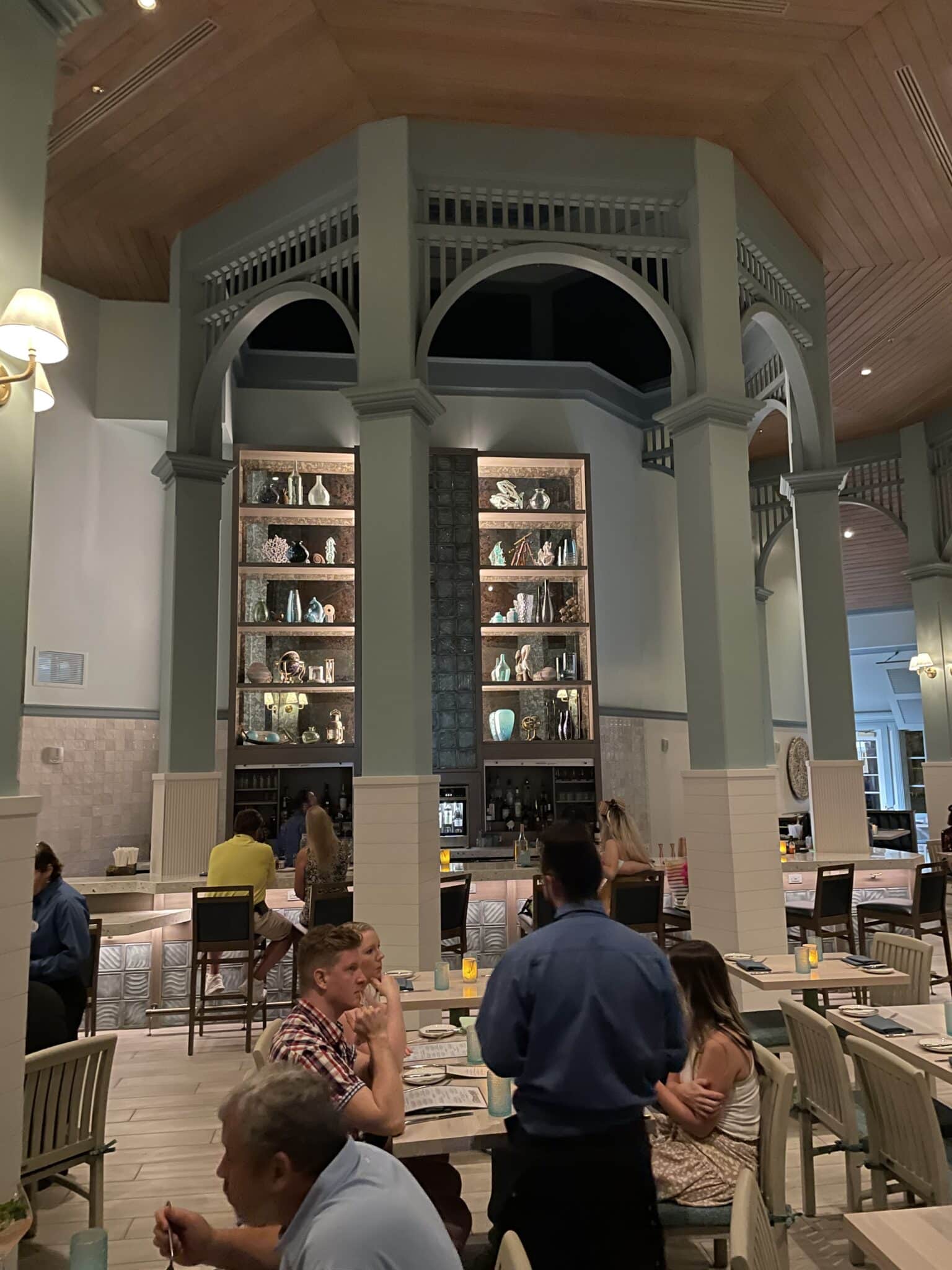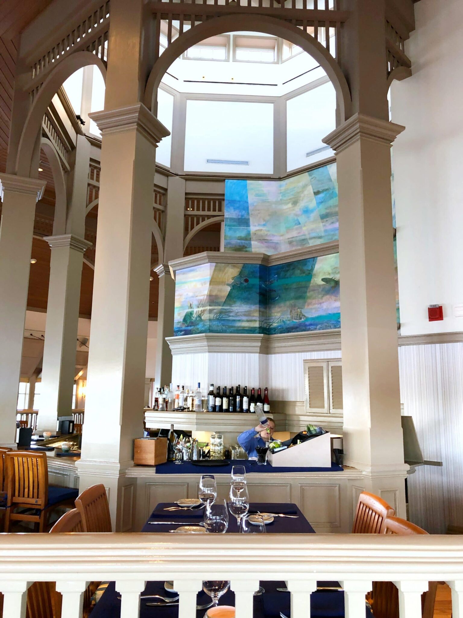 Previously, Narcoossee’s featured a unique dual-level dining room and a sunken bar area. Water and fishing-themed murals adorned the walls behind the bar and royal blue table clothes led to the coastal feel of the restaurant. The refurbishment has elminitated that dual level, and the warm wood tones have now been replaced with white-washed wood and cool blue tones on the walls.