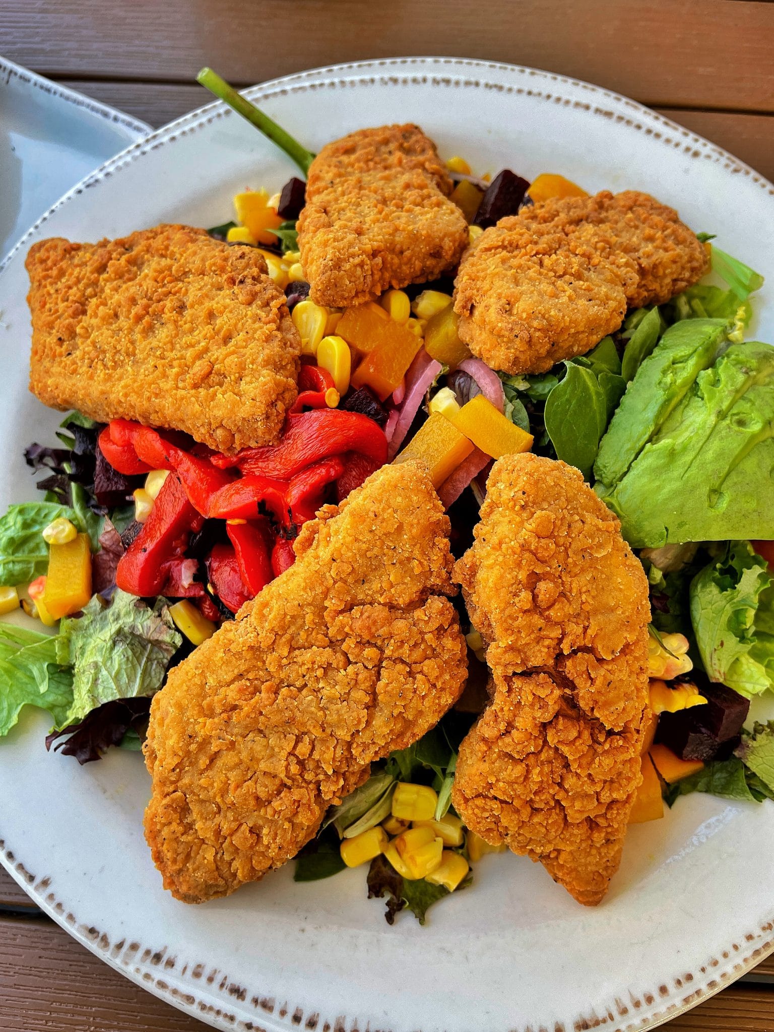 Here is the salad I got the other day, showcasing the new Morningstar Farms Incogmeato tenders. I combined a few of the salad ingredients to have a sort of “Frankenstein” salad.