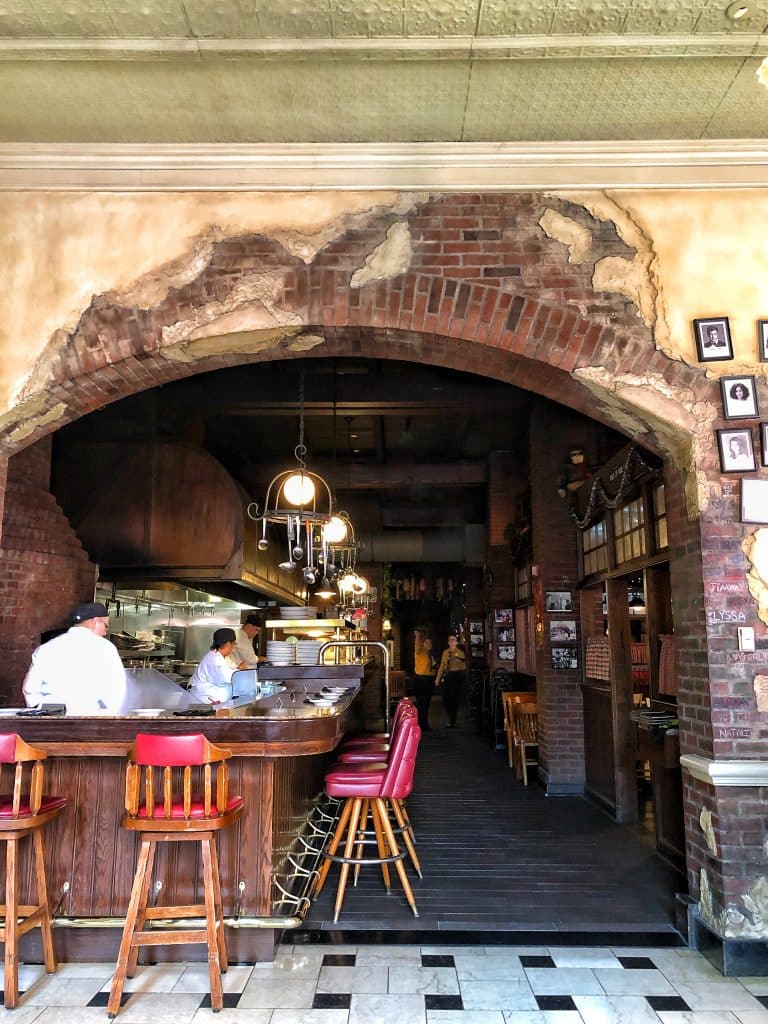 The interior of the restaurant is about as home style Italian as you can get with both tiled and wooden floors and stuccoed walls giving way to red brick. Photos of celebrities and graffiti line the walls as twinkle lights and cured faux meats and cheeses hang overhead.