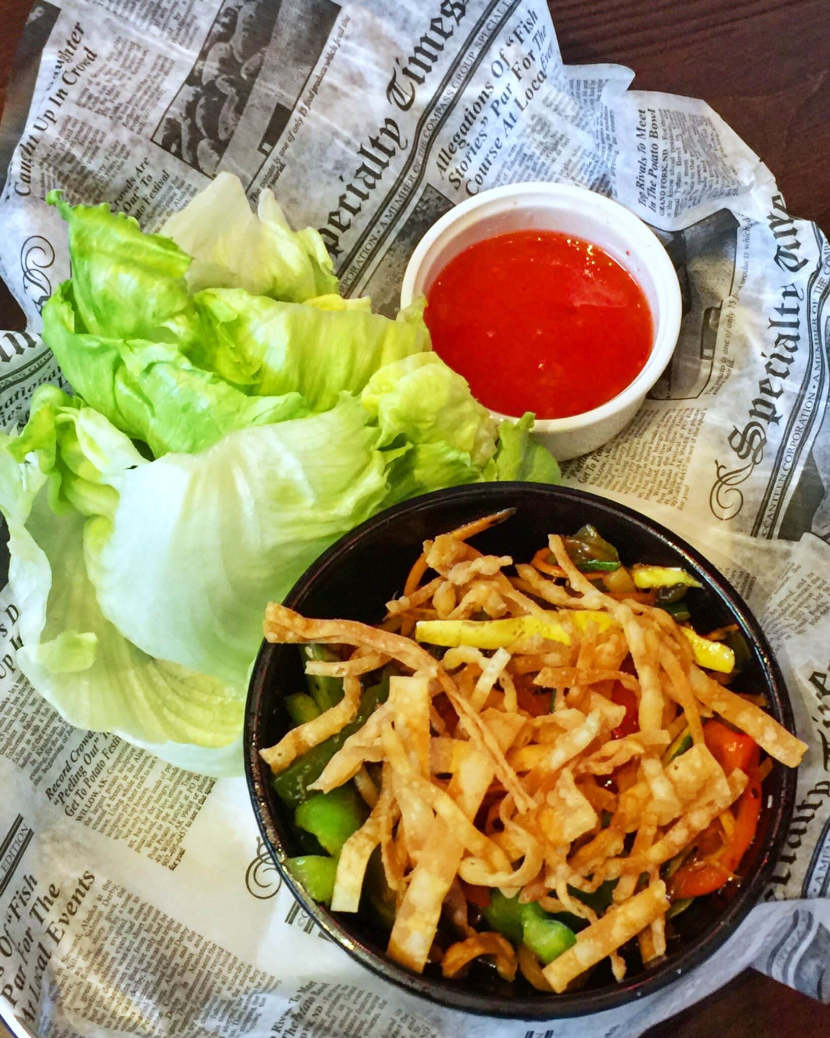 Another surprisingly flavorful dish was the Veggie Lettuce Wraps ($12) off the Appetizer Menu. These included a medley of sautéed bell peppers, onions, carrots, squash, and zucchini in Asian sesame marinade served with a side of sweet and sour sauce, iceberg lettuce cups and crispy wontons…sometimes.