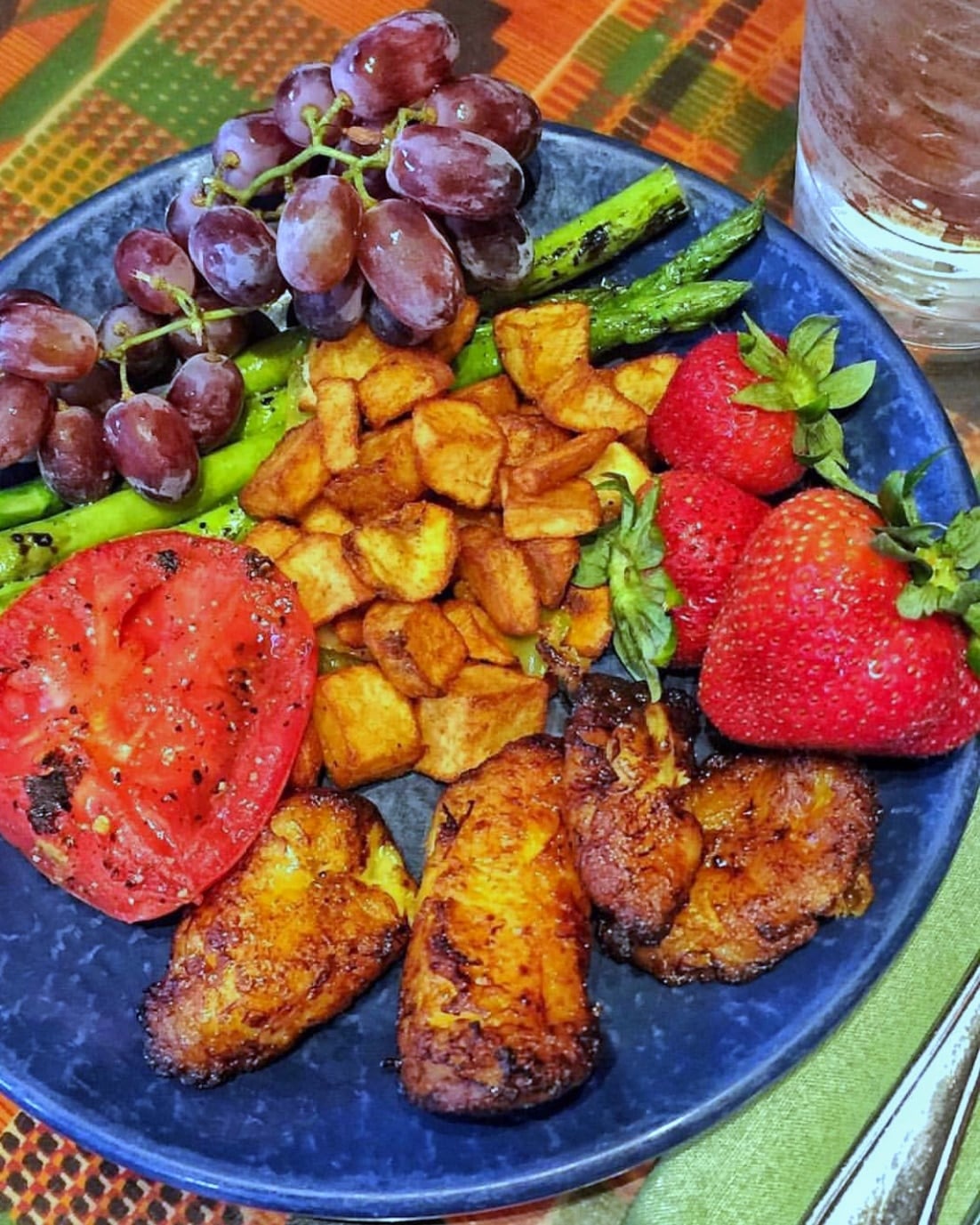 These items are all vegan friendly off the buffet line… fresh fruit, grilled asparagus, grilled tomatoes, plantains and breakfast potatoes.