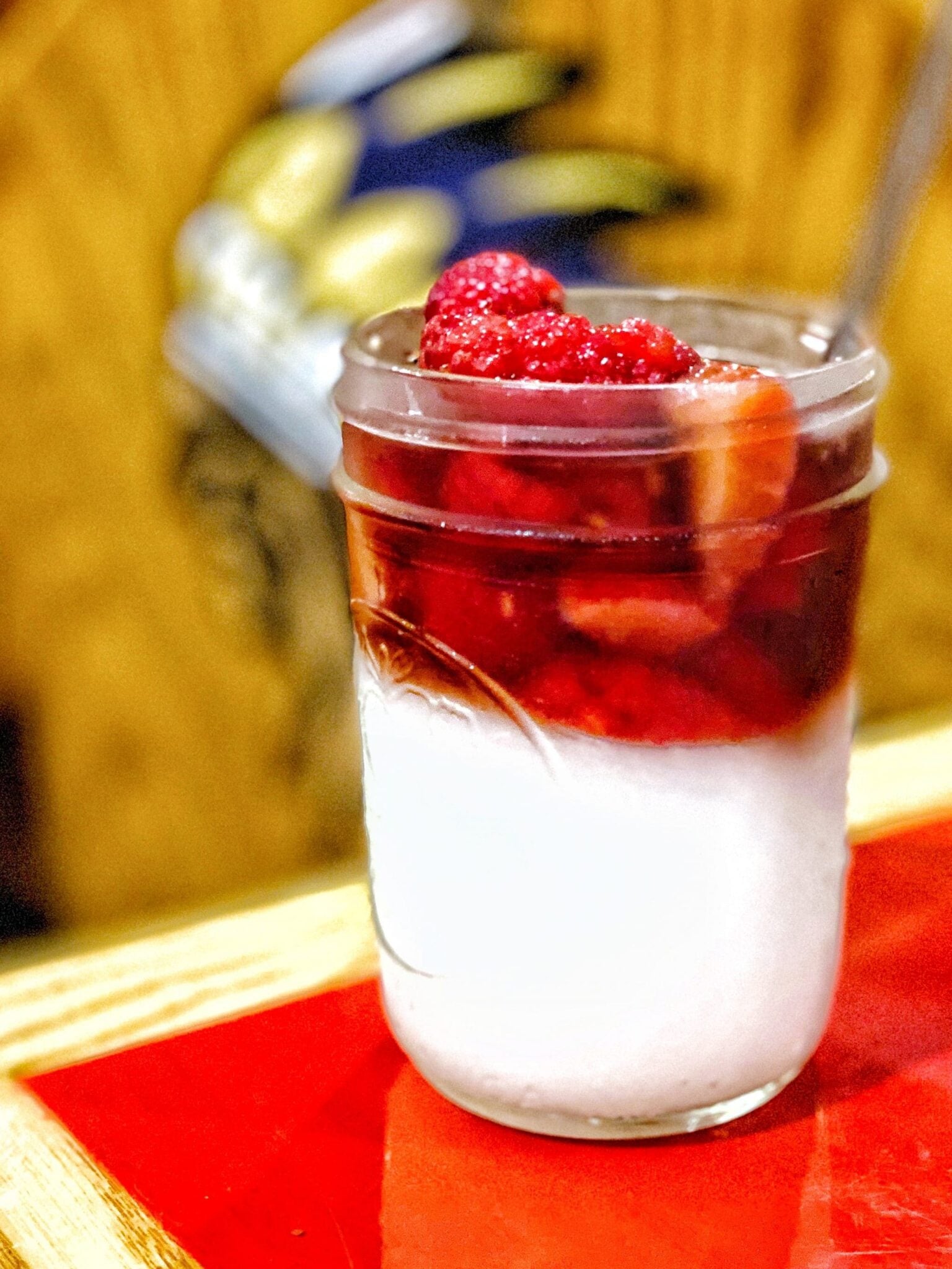 It’s a simple dessert that starts with a base of rice milk panna cotta which is topped with a compote of strawberries and marionberries.
