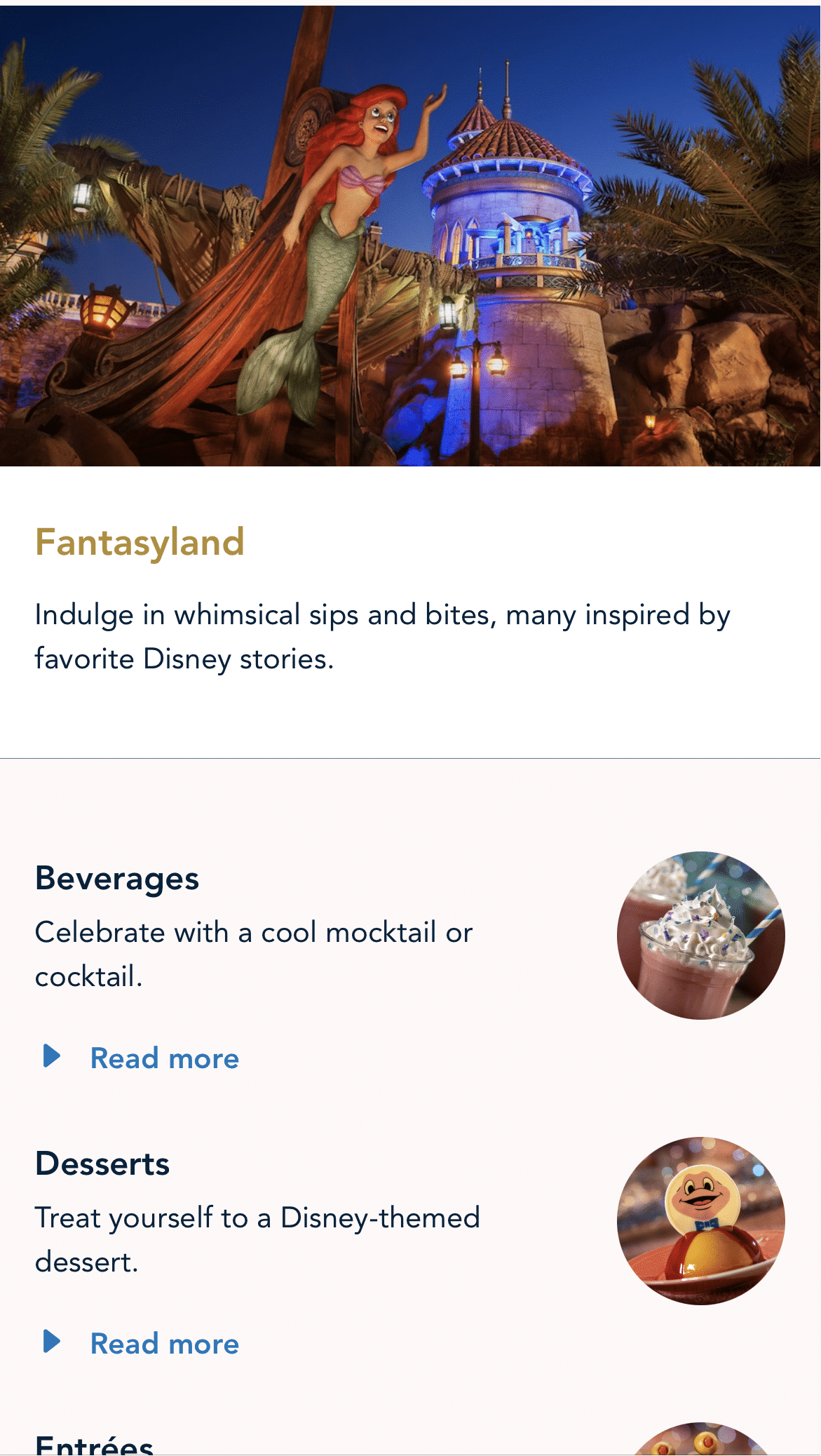 You then have to click on each park or area to see the list. From that point, you will need to expand each section (drinks, desserts, entrees, snacks, etc.):