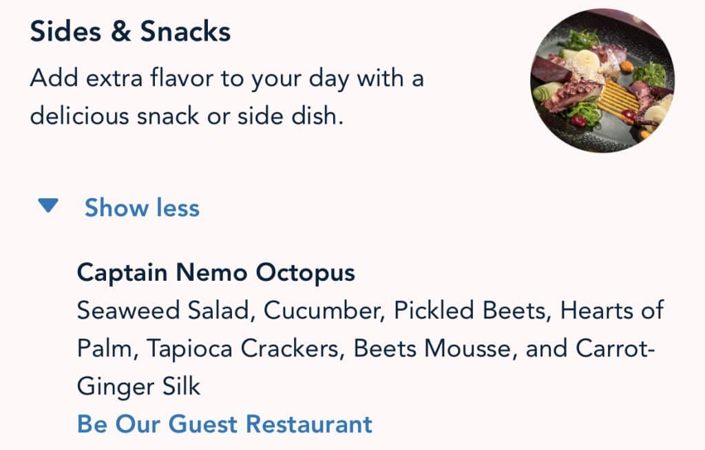 There is one other item, which may be modifiable, a seaweed salad at Be Our Guest restaurant. However, the salad normally comes with actual octopus tentacles, and I’m not sure why you’d want to go to Be Our Guest and get a seaweed salad. If this turns out to not be real octopus, I will of course update, but from the tiny photo, it looks like the real thing (update, it is), and as we know, fish are friends, not food.