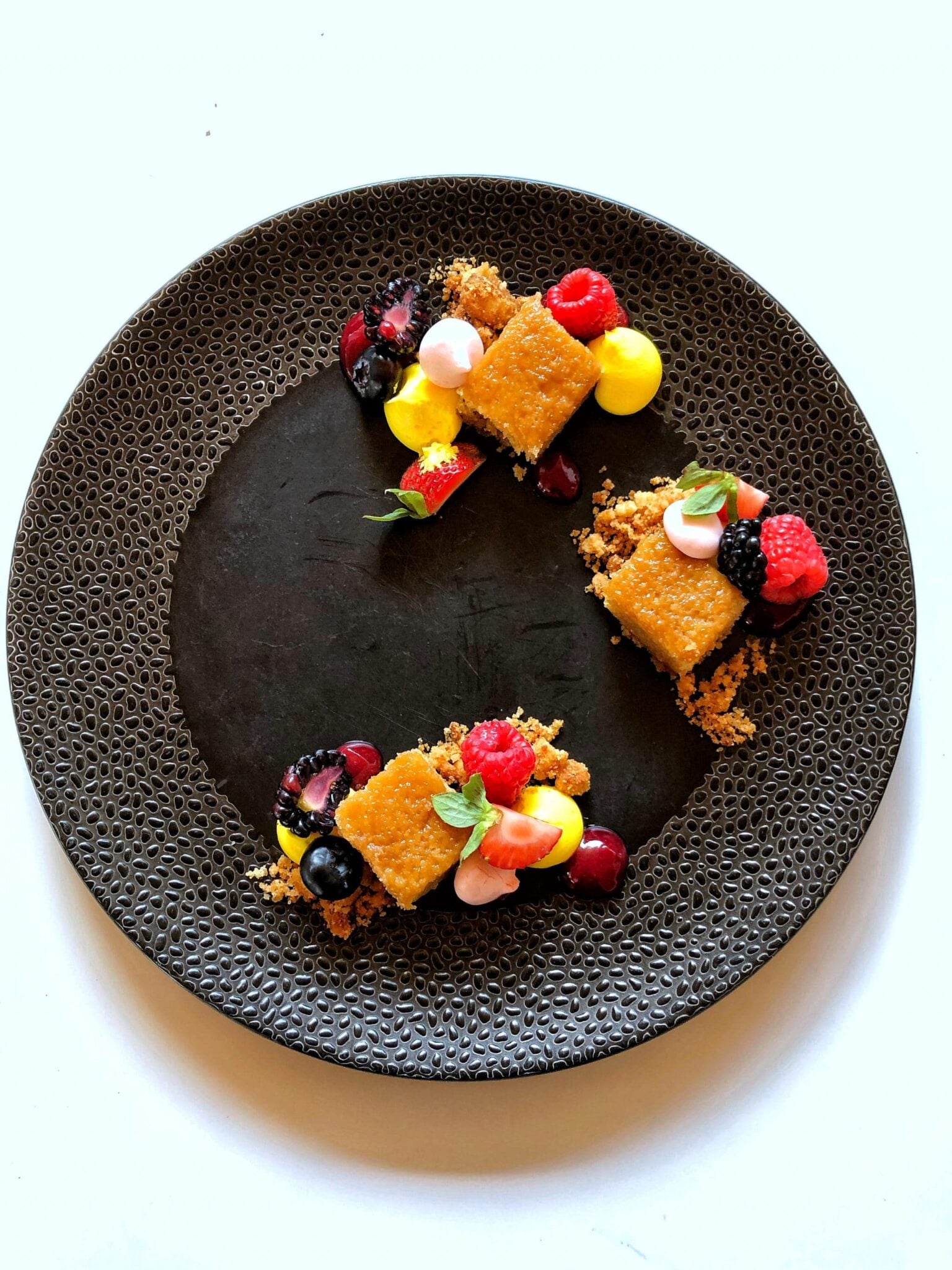 The plate is composed of three small squares of glazed cake alongside lemon curd, berry compote, fresh berries and strawberry aquafaba meringues.