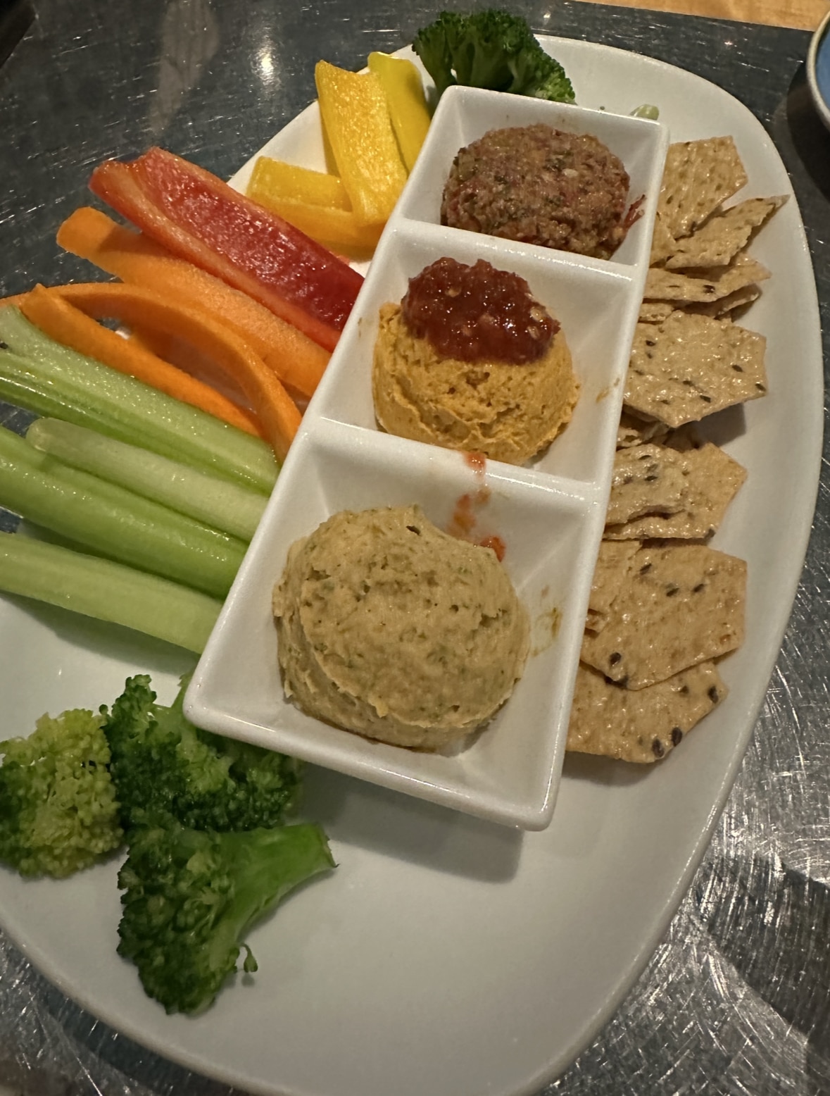 Coral Reef restaurant is one of the few places to see what original EPCOT looked like (though the Living Seas did not open until 1986, 4 years after EPCOT Center) and we have some new vegan options! Some vegans do not enjoy dining here because it is a restaurant where every table faces the giant aquarium housed inside the Seas pavilion (formerly the Living Seas, now Seas with Nemo and Friends). Even crazier, is eating seafood while looking at the fish, but we definitely won’t be doing that. It’s of course up to you if you want to dine in this space, and the vegan options have never been something to really entice us vegans to flock to this spot. Previously, it was a Grilled Vegetable Skewer with Impossible Kefta, and it was actually delicious. The appetizer was previously some hummus dips with veggies.