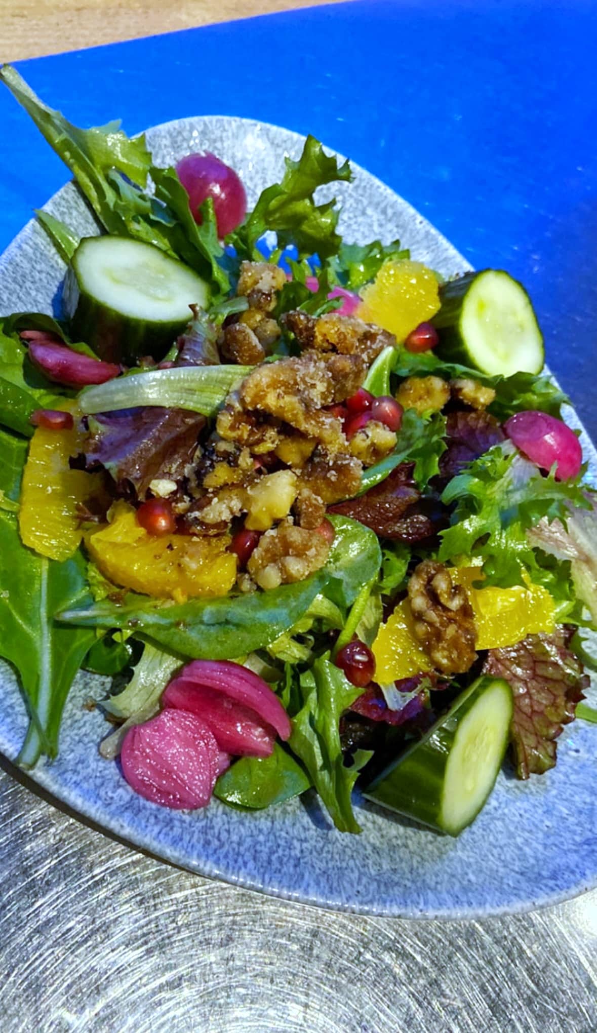 First up, the new salad is the Reef Salad – $11. Seasonal mixed greens and pickled vegetables with pomegranate vinaigrette and walnut praline, it is plant-based as-is with no modifications. Britt said the veggies definitely tasted pickled, which I love, so I’ll definitely have to give this one a try. It looks wonderful: