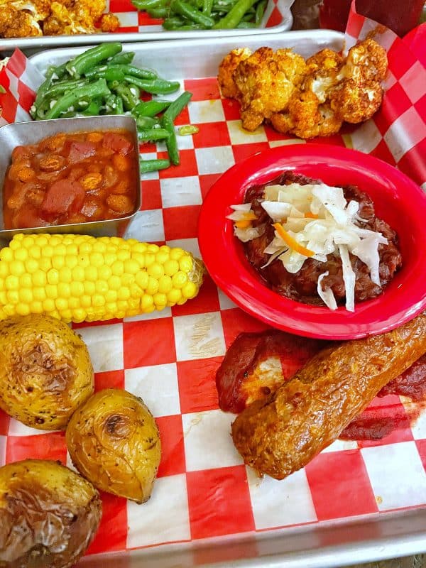 You’ll find the following included in this offering: Italian Field Roast sausage over marinara, BBQ’d jackfruit, seasoned roasted cauliflower, green beans with garlic, baked beans, corn on the cob, and roasted baby potatoes.