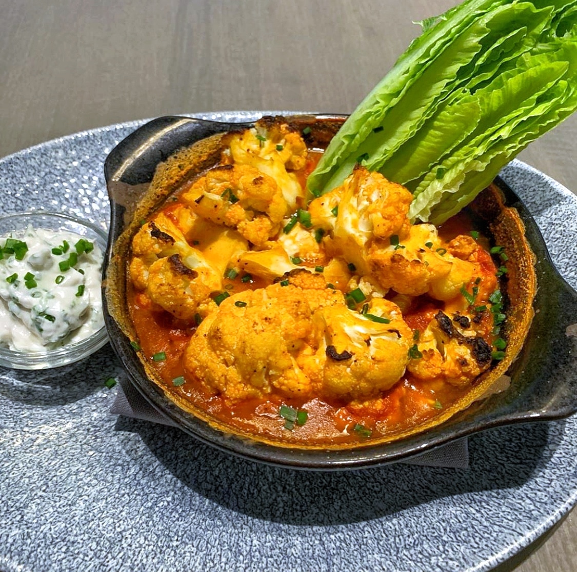 This is the modified Roasted Buffalo-style Cauliflower with hearts of romaine and vegan herb ranch.