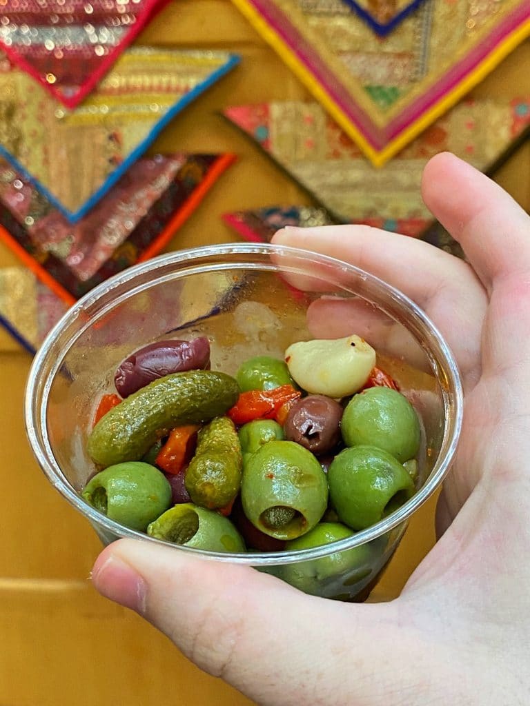 Now let’s get to the snacks! Similar to the olives that come with the hummus and naan (or multi-grain toasts on the vegan version), the first option is Mediterranean Olives for $5.25. More than just similar, they are exactly the same mix of kalamata and green olives, peppers, cornishons (or gherkins), and whole garlic cloves in a house-made marinade. Again, I don’t usually like olives, but these are marinated so well, even I enjoy them.