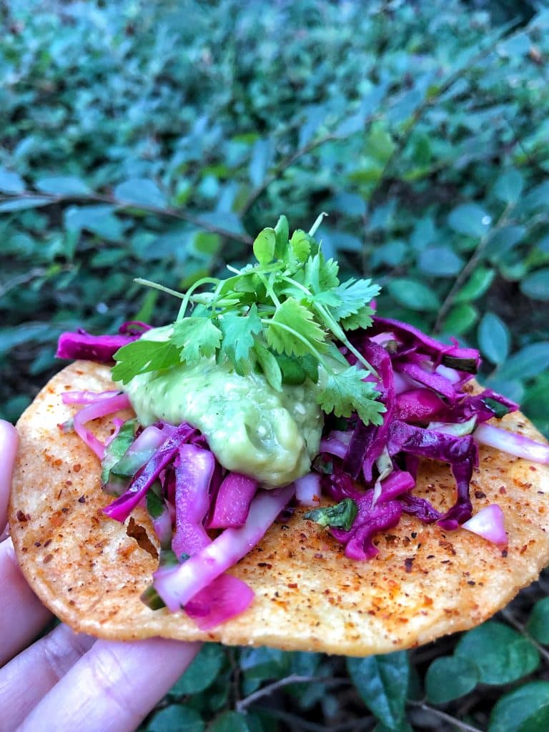 It comes with a crunchy dressed red cabbage slaw and a vegan friendly fire-roasted tomatillo sauce on a tajin dusted crispy fried tostada garnished with cilantro.