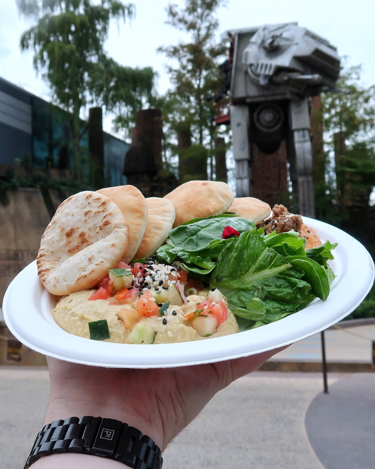 Disney’s Hollywood Studios just added a brand new vegan Star Wars themed dish to the menu at Backlot Express. This is the Two Suns Hummus.