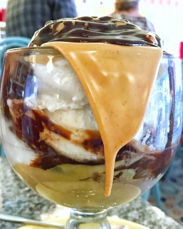 It’s a peanut butter and chocolate delight featuring cool vegan vanilla ice cream, non-dairy chocolate & warm peanut butter sauce.