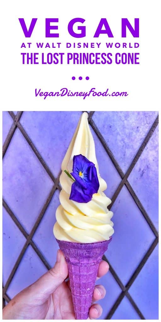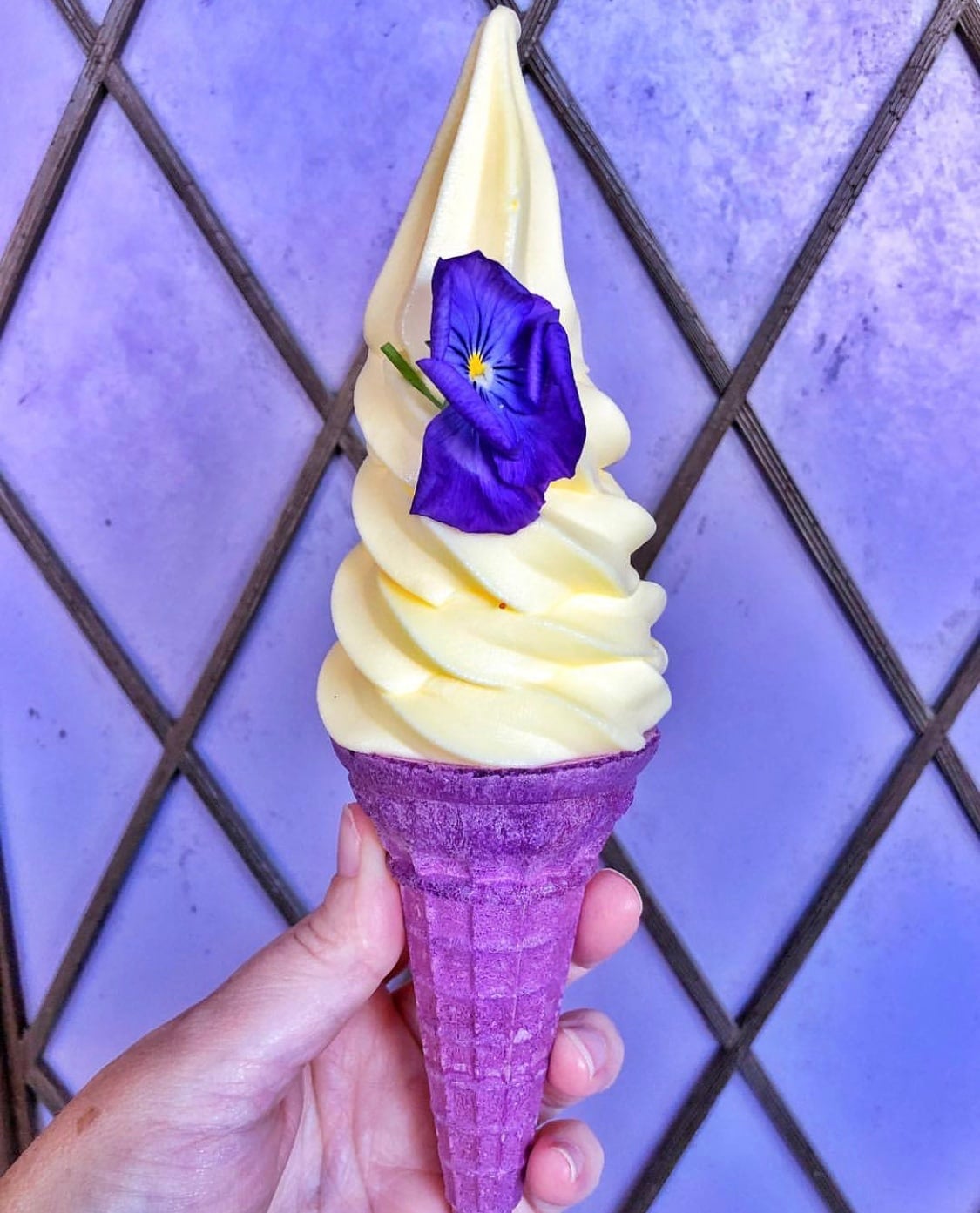 Its The Lost Princess Cone. Fashioned after Rapunzel’s hair, it starts with a purple cone, topped with lemon Dole Whip soft serve and edible flowers.