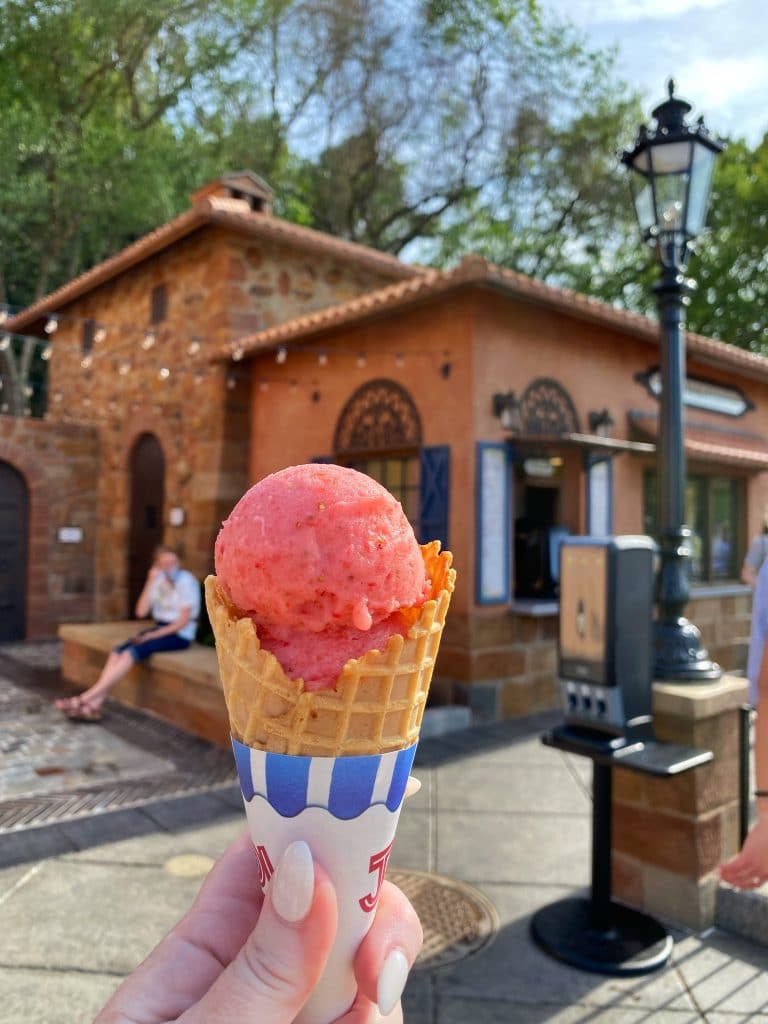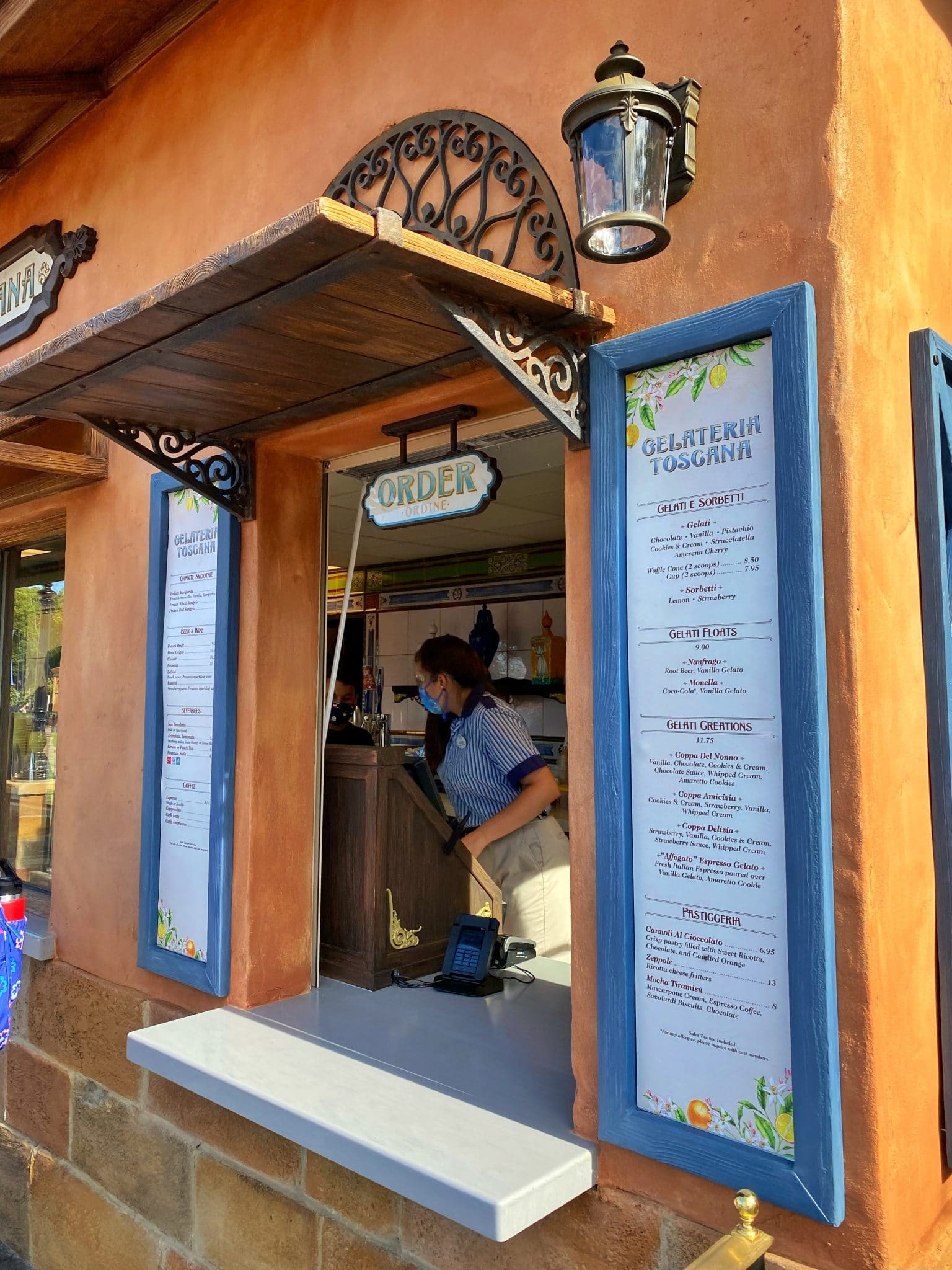 The Gelateria Toscana is a great addition visually to the Italy pavilion. While we don’t have too many vegan options, we do have a couple, so a good option when you’re in the mood for something sweet or tart and frozen on the very hot Florida days we are currently experiencing.